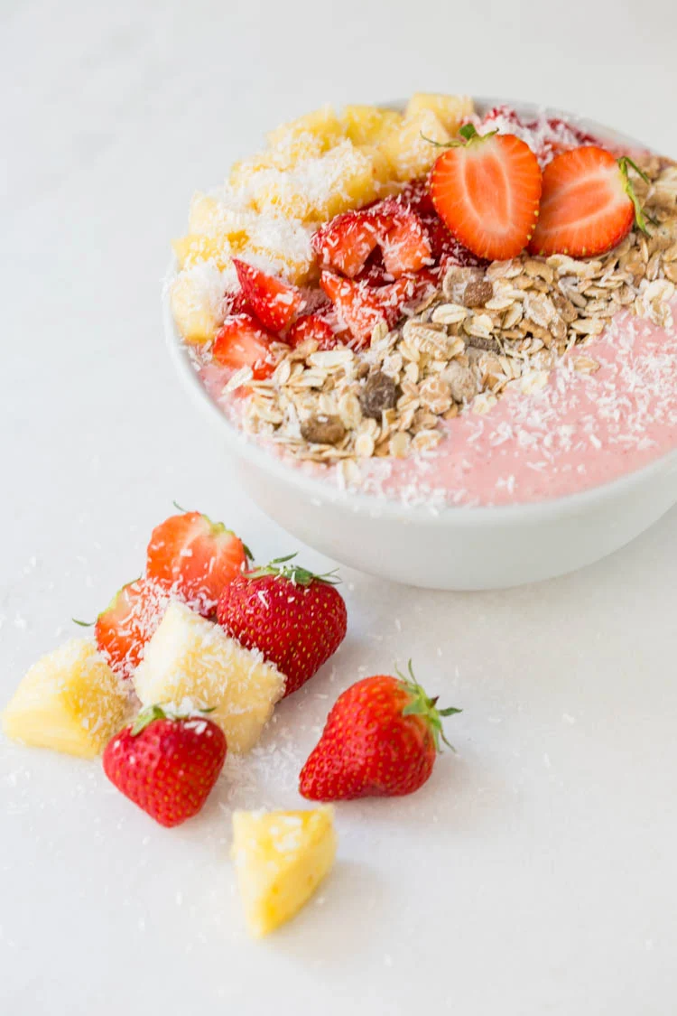 - Schenk de smoothie in een kom en verdeel de verse ananas en aardbeien (in stukken), muesli en tot slot de geraspte kokos erover.