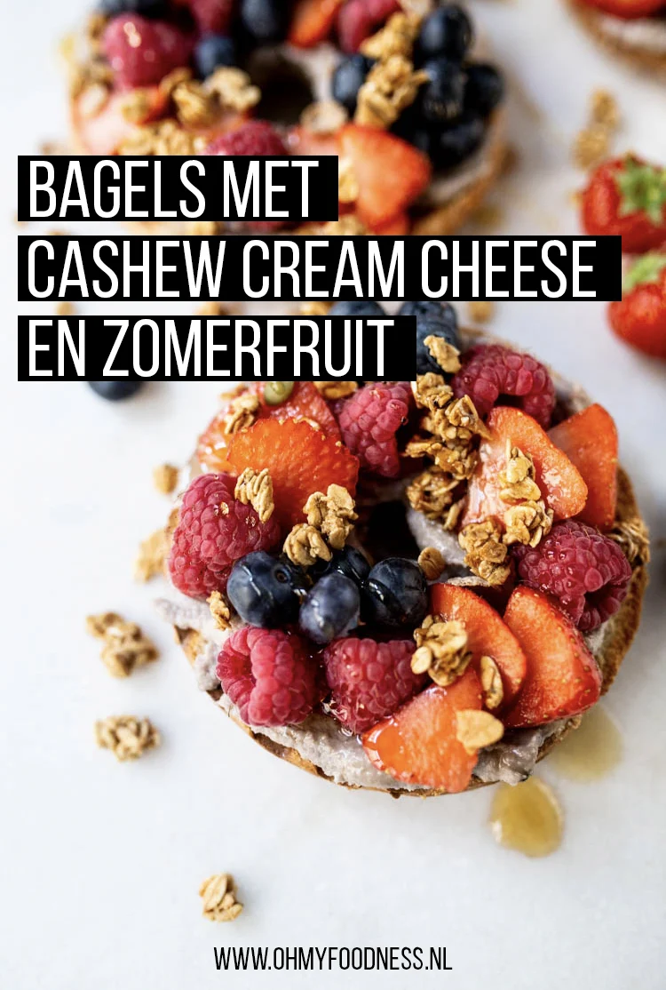 Maar van cashewnoten kun je dus ook heel goed cream cheese maken. Iets wat ik wel vaker doe en door de ingrediënten die je er verder nog aan toevoegt, kun je bepalen welke kant het op gaat. Een beetje hartig, zodat je het ook als dip kunt eten. Of lekker zoet, om als staartvulling te gebruiken. Óf zoals in dit geval als spread voor op je bagel. Ik voegde er namelijk een beetje honing aan toe, banaan en nog wat zomerfruit en daarmee was de basis voor deze bagel gemaakt. Vervolgens de bagels roosteren, besmeren met de cashew cream cheese en dan ‘versieren’ met flink wat zomerfruit, granola en maple syrup. Een lekker ontbijt!