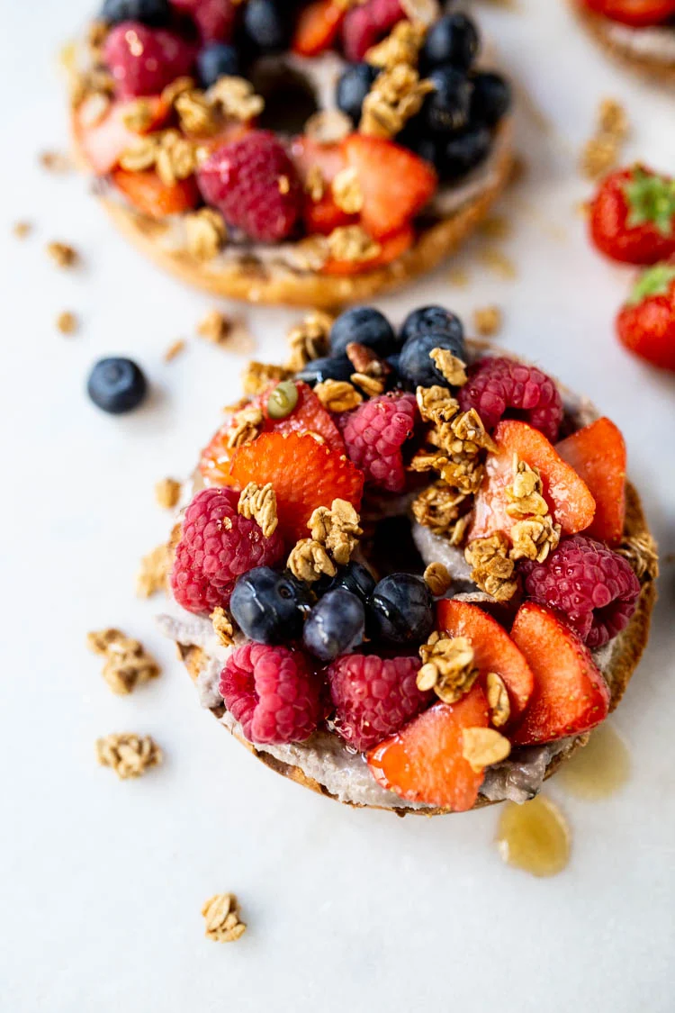 - Beleg de bagels nu met het zomerfruit en strooi er wat granola overheen. Maak af met een beetje maple syrup (of honing).