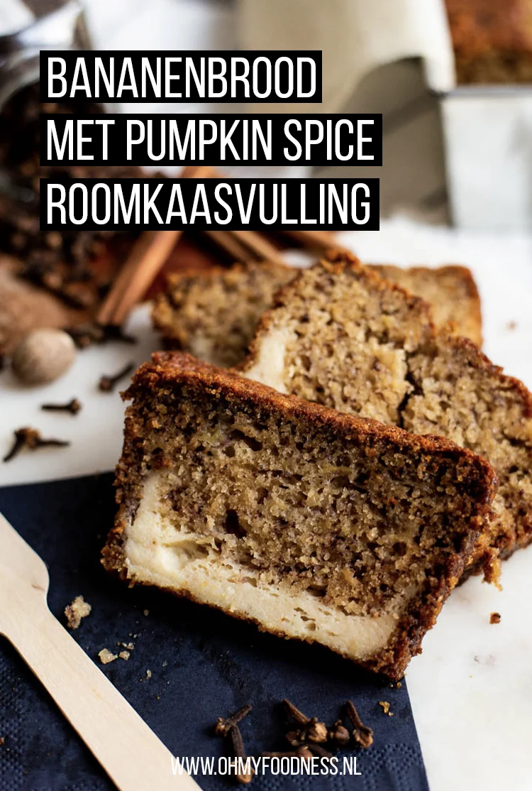 Vlak na het Pop-Up Cheesecakecafé had ik nog een aantal leftover ingrediënten in mijn koelkast waar ik echt iets mee moest maken. Eén van die dingen was 1,5 kilo roomkaas. Nu was het makkelijk geweest om gewoon weer cheesecake te maken maar heel eerlijk, na 118 cheesecakes had ik daar even genoeg van – haha. In onze fruitschaal lagen ook wat bananen te verpieteren en de logische oplossing was natuurlijk om daar dan ook iets mee te doen. Ik had wel zin in bananabread maar dan niet per se in de standaard variant die je met twee vingers in de neus kunt maken. Ooit maakte ik voor OMF al eens een bananenbrood met roomkaasvulling en dat besloot ik nu ook weer te doen. Ik gebruikte mijn pumpkin spices om het geheel een herfstig tintje te geven en het resultaat is overheerlijk. Een echt herfstig bananenbrood, lekker klef en heerlijk als snack voor onderweg of als plak cake bij de koffie. En ik was weer wat van de voorraad roomkaas kwijt, hoera!