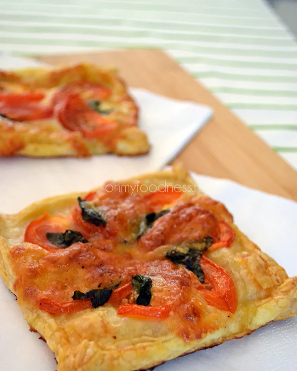 4. Na 15 minuten op een bakplaat in het midden van de oven is het bladerdeeg goudbruin, de mozzarella lekker gesmolten en zien de tomaatjes er prachtig uit.