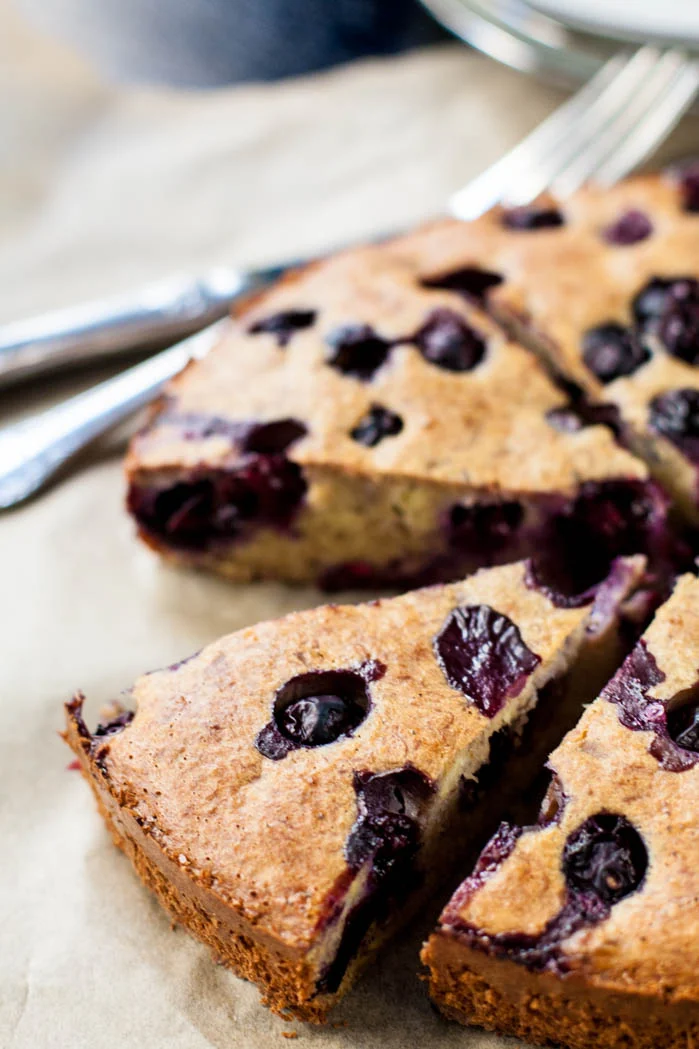 Ik bleef hangen bij het ‘Goed begin van de dag’ hoofdstuk, ontbijtjes dus. Deze zijn meestal zoet en tja, daar ben ik gek op. De ontbijtcake met blauwe bessen leek me perfect, dan heb ik namelijk gelijk voor meer dagen al ontbijt gemaakt aangezien je zo’n cake niet in één keer naar binnen werkt. Ik sneed hem in acht stukken en 1 stuk was voor mij voldoende om mee te ontbijten, wat een vuller zeg. Lekker zoet door de rijpe bananen (een must) en fris door de blauwe bessen. Hieronder het recept!