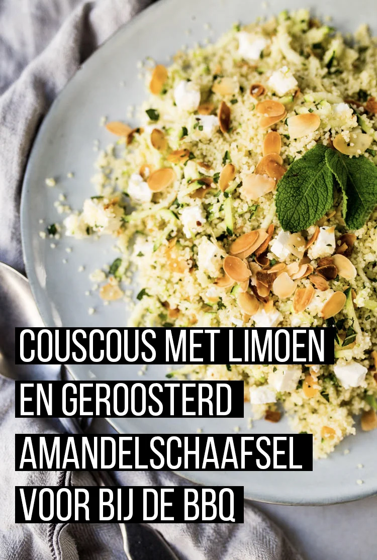 In de categorie ‘makkelijke en snelle recepten’ is dit er eentje. Een perfect bijgerecht en voor de zomerse dagen die we hebben; ideaal voor bij de barbecue. Couscous is namelijk zo gemaakt, even water koken, over de couscous gieten en in laten trekken. Ondertussen rasp je de courgette (met een keukenmachine gaat dit lekker snel) en rooster de je het amandelschaafsel. Wat limoen raspen, uitpersen en alles met elkaar mengen. Ikzelf vind dit ook een prima zomerse maaltijd, voor als ik even makkelijk en lekker wil eten. Maar omdat het een frisse en lichte salade is met niet al te veel ingrediënten, vind ik ‘m dus ook ideaal als bijgerecht.