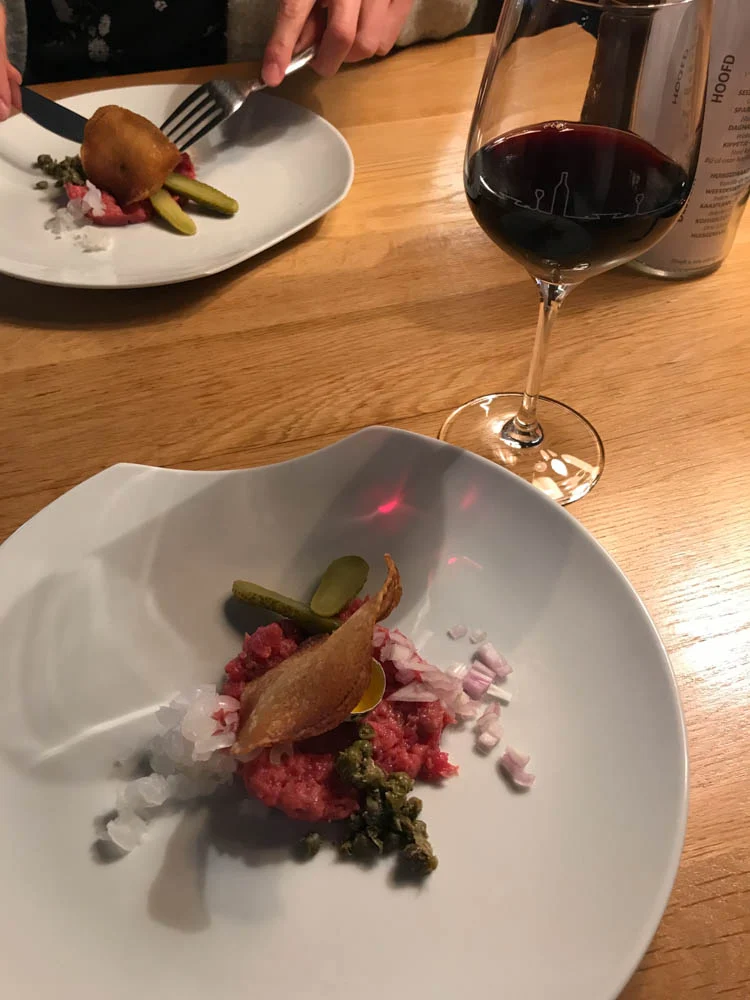 Onze wandeling in Arnhem startte niet ver van het station vandaan. Bij HANS eten en drinken. Hier kregen we een heerlijke steak tartare met erbij een glas rode wijn. Om twaalf uur starten met een glas rode wijn vond ik even pittig, maar de kop was er wel gelijk goed af zeg maar ;-)