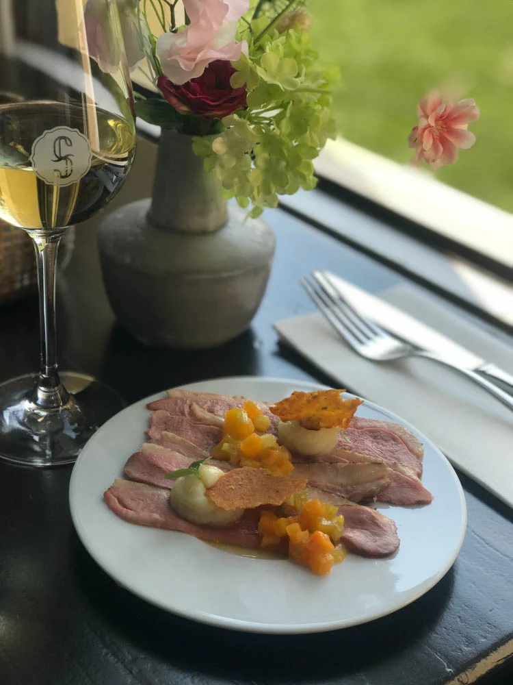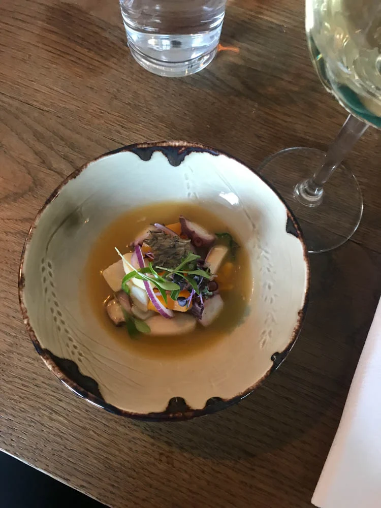 Dit gerecht aten we bij toch wel de mooiste locatie van allemaal; Stadsvilla Sonsbeek. Prach-tig. Gelegen op een heuvel, in het park. Met uitzicht over de stad. Het gerecht vonden we helaas een stuk minder lekker dan we gehoopt hadden. Mooi opgemaakt maar het was vrij vlak van smaak. Hier hoorde overigens een glas rood bij maar daar had ik wel even genoeg van gehad dus ik vroeg om een glas wit.