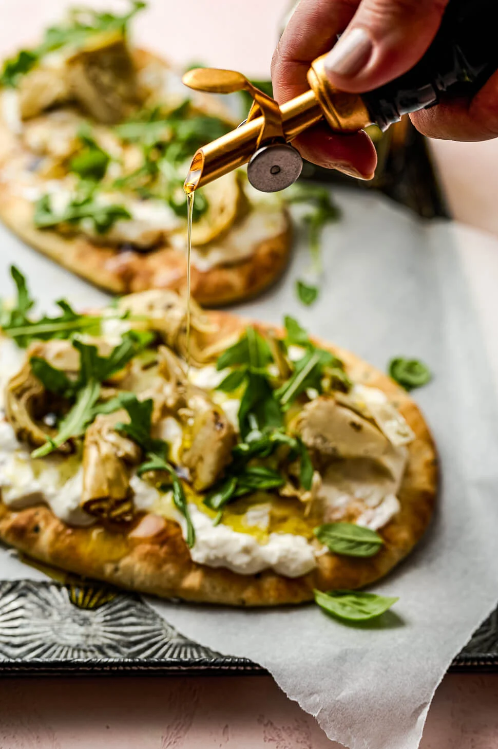Omdat ik bijzonder weinig zelf heb gemaakt voor dit recept, is de flatbread pizza burrata en gegrilde artisjok in no time klaar.