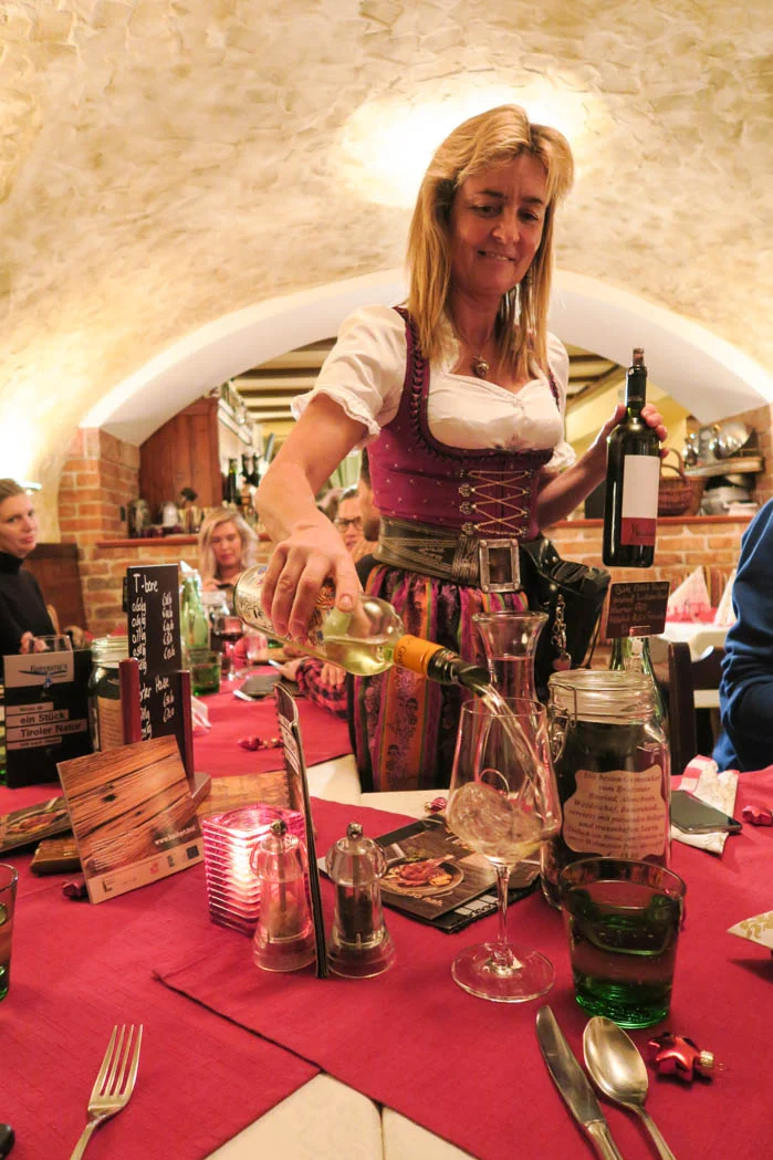 Het allerleukste aan reizen vind ik iedere keer opnieuw het eten. Iedere plek heeft zo zijn lokale producten en gerechten en of ik nu in België of in India ben, overal kan ik wat lekkers op de kaart vinden. Of op straat, want vaak worden de lekkerste snacks daar verkocht. Dat ik deze keer op wintersport in Tirol was, betekende dat ik ook op pistes zou eten. En het eerste restaurant dat ik daar binnenstapte, deed me er gelijk aan herinneren dat die berghutten er vaak allemaal hetzelfde uitzien. Hout, tafels met bankjes (schuift lekker makkelijk aan in je skikleding) en een lopend buffet waar je je bordje vol kunt laten scheppen met een warme maaltijd. Skiwasser ontbreekt er nooit en als het zonnetje lekker schijnt, eet je buiten. Het is een geheel eigen cultuurtje te noemen en wat mij betreft altijd erg gezellig. Nadat je hebt lopen ploeteren (in mijn geval) of heerlijk je best hebt gedaan op de piste, kom je met vrienden of familie bij elkaar en lunch je samen. Als je dus niet met zijn allen samen de pistes afgaat, is dit het moment dat je elkaar weer even ziet.