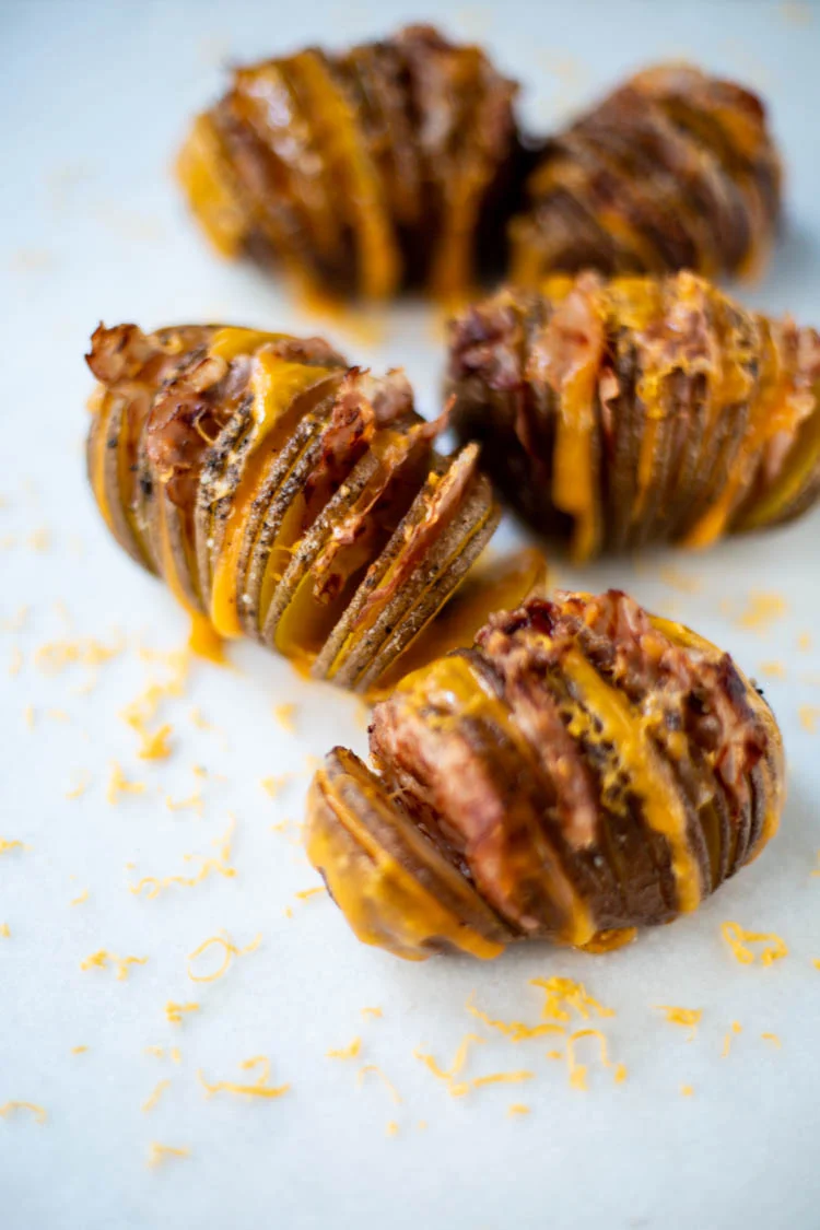 - Als de aardappels gaar zijn (test voorzichtig met een vork door erin te prikken), haal ze dan uit de oven en stop afwisselend de bacon en de cheddar ertussen. Schuif voor nog 5 minuten in de oven.