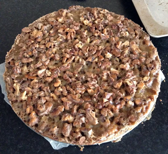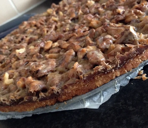 - Let erop dat je de taart na het bakken goed af laat koelen. Doordat de suiker wordt verwarmd ontstaat er karamel en dit is héél erg heet. Dit zorgt ervoor dat de walnoten aan elkaar blijven plakken dus het is wel absoluut onmisbaar.