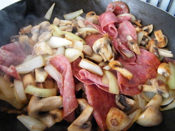 - Voeg zodra de geur van het vlees goed vrijkomt de in stukken gesneden champignons en de grof gesneden ui toe. Je kunt het vuur nu wel weer iets hoger draaien aangezien het vocht ui de champignons ervoor zorgt dat je vlees niet verbrand. Goed om blijven roeren maar op zijn tijd ook even laten rusten zodat de champignons en de ui kunnen slinken en kunnen aanbakken.
