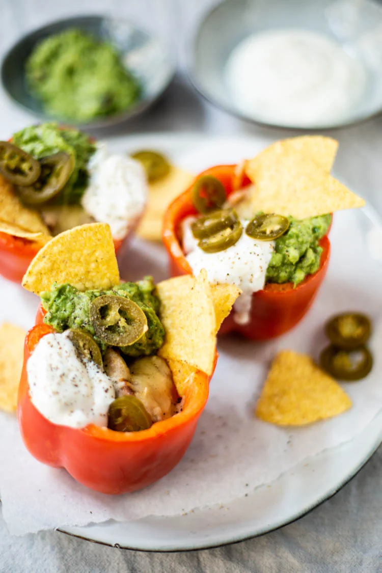 - Als de paprika's klaar zijn verdeel je over iedere paprika wat van de guacamole, een dot kwark en wat nacho's. Voor de liefhebber ook wat jalapeños.