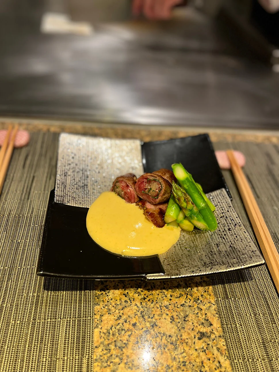 Tijd voor de avond der avonden en het lekkerste diner dat ik sinds TIJDEN heb gehad. Samen met vriendin Nanda ging ik eten bij Sazanka, het teppanyaki-restaurant van Hotel Okura in Amsterdam. Je neemt plaats aan de plaat, krijgt een schort om en recht voor je neus wordt het eten bereidt door een Japanse chef.