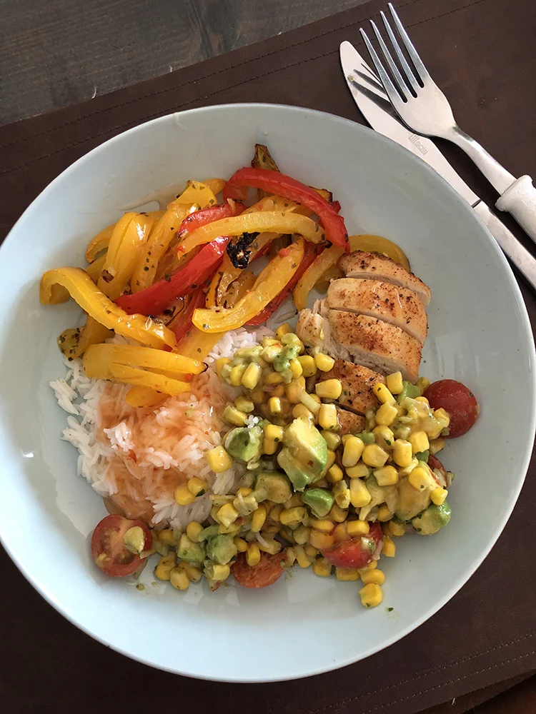 Het was de bedoeling dat ik woensdag ook iets OMF-waardigs zou maken maar mweh, uiteindelijk vond ik dat het net niet. Neemt niet weg dat het eten wel lekker was trouwens. Ik stopte paprika’s en kipfilet met Cajunkruiden in de oven en maakte salsa van mais, avocado en cherrytomaatjes. Erbij wat rijst en voor de smaak wat zoetzure chilisaus er overheen.