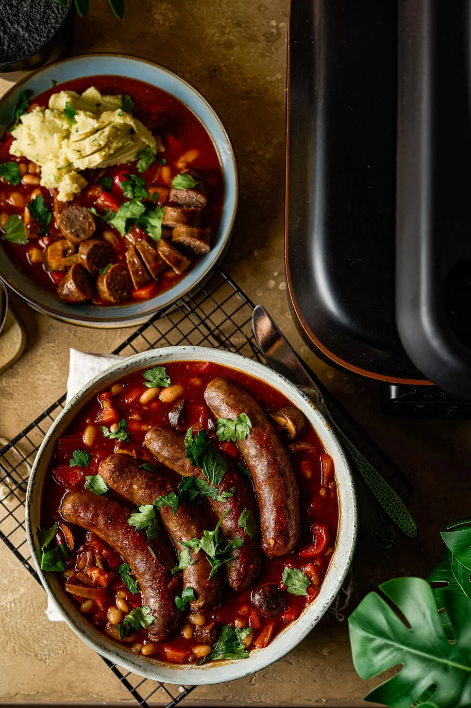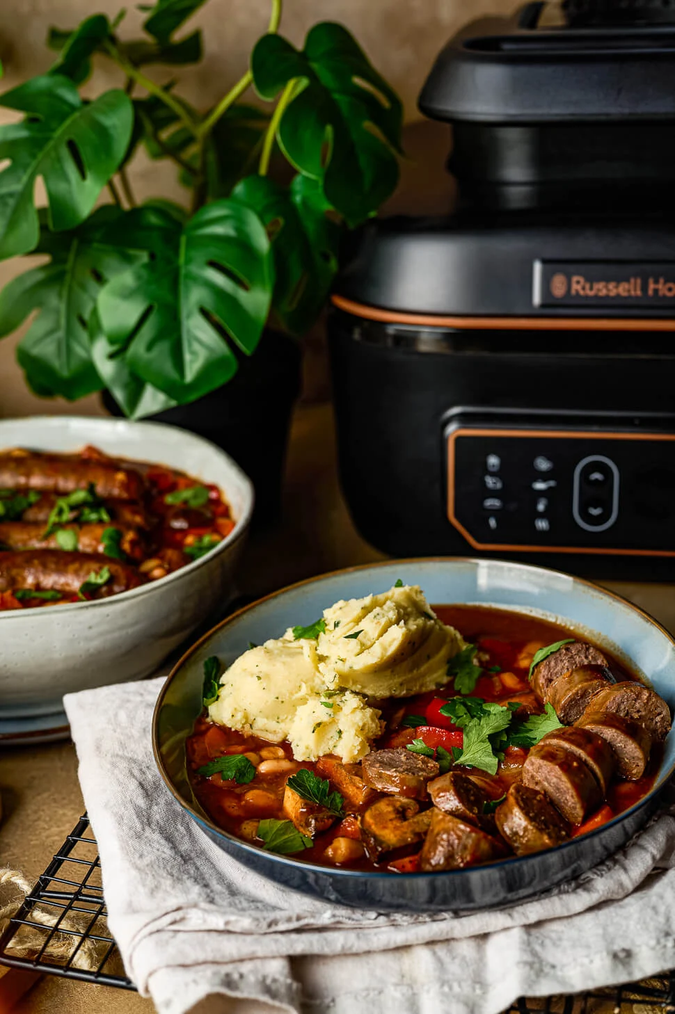 Dit recept heb ik specifiek geschreven voor de Russell Hobbs Satisfry Multicooker. Die heeft zowel een handige schroeistand waarmee je de worstjes kunt aanbraden, maar dus ook twee slowcook-standen waar je uit kunt kiezen.