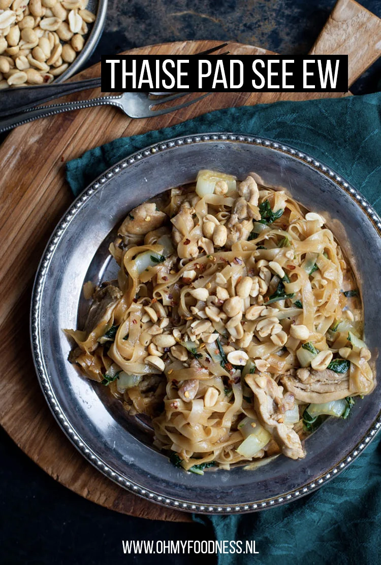 Veel mensen associëren de Thaise keuken met extreem pittige gerechten en dat snap ik enigszins wel. Tijdens mijn stage in Bangkok heb ik me meer dan eens vergist in iets dat op een sperzieboontje leek en vervolgens een groene peper bleek te zijn. Bij somige gerechten is het inderdaad belangrijk dat je no spicy aangeeft wil je er na één hap nog iets van proeven en ja, op ieder tafeltje in ieder restaurant vind je nog een kommetje chili-olie want het kan die Thai allemaal niet spicy genoeg zijn. Toch zijn er ook meer dan voldoende gerechten te vinden die totaal niet pittig zijn. Niet iedere curry is namelijk even pittig en ook Pad Thai bevat nul peper. Hetzelfde geldt voor Pad See Ew, een gerecht dat gemaakt wordt met dikke rijstnoedels en Chinese broccoli. De rijstnoedels die in dit gerecht doorgaans worden gebruikt zijn vaak zo’n twee à drie centimeter breed en in Nederland helaas heel lastig te krijgen. Gelukkig zijn noedels van 1 centimeter breed ook erg lekker en die vind je gewoon in de supermarkt. Als je een toko in de buurt hebt waar je Chinese broccoli kunt krijgen dan raad ik je aan dit te kopen. Heb je geen toko of simpelweg geen zin om er eentje op te zoeken dan werkt Paksoi ook prima in dit gerecht, dat heb ik namelijk ook gebruikt! Mijn versie van Thaise Pad See Ew is weliswaar niet het authentieke recept maar lekker is het zeker. Als je zin hebt in een makkelijke maaltijd, niet pittig wilt eten maar wel de Thaise smaken op je bord wilt, is dit gerecht een topper.
