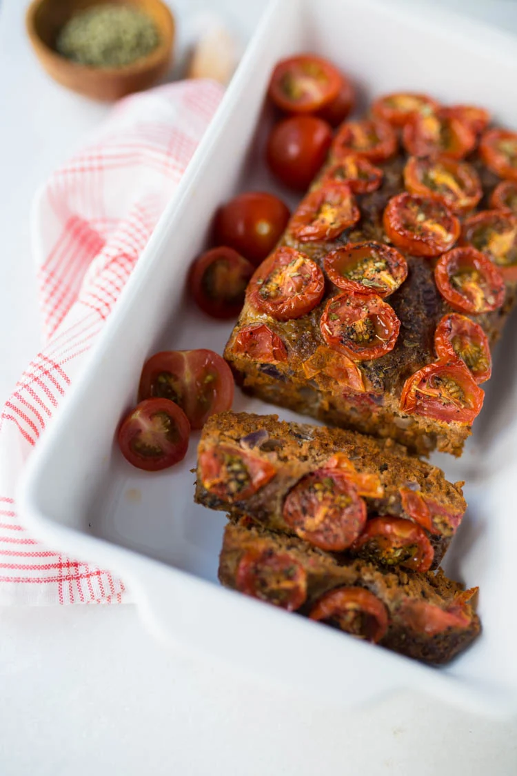 Sabine maakte er al eens eentje met een lekkere marinade erover, ik bedacht deze tomatenvariant. Erg lekker als bijgerecht en best makkelijk te maken. Je kneed de ingrediënten door elkaar en daar waar je normaal ballen staat te kneden, mik je het deze keer in een cakevorm. Schuif in de oven en laat lekker garen tot de bovenkant een mooi kleurtje heeft. Heb je ondertussen mooi de tijd om een salade en wat aardappeltjes te maken, 2 dingen die denk ik heel lekker bij dit gehaktbrood zijn.