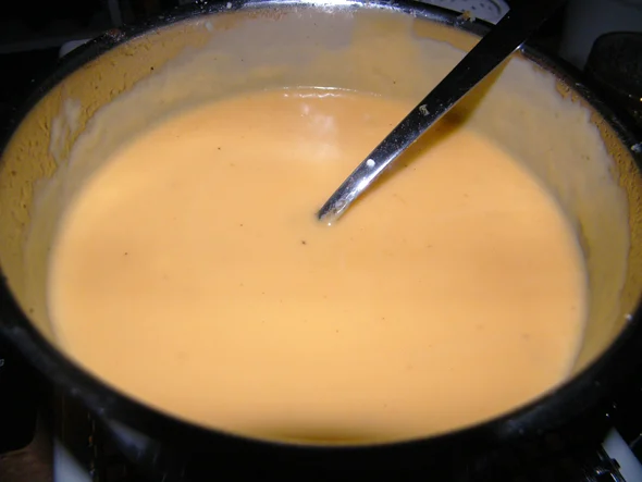 - Wanneer alle kaas gesmolten is en er geen klontjes meer zijn voeg je de maizena en de kruiden toe. Nog even goed doorroeren, maar zorg ervoor dat de fondue niet begint te koken. Giet het kaasmengsel in een fonduepan of serveer het pannetje gewoon zo op een warmhoudplaatje zodat de kaas wel een beetje warm blijft. Overigens wordt de kaas nog wat dikker wanneer het op tafel staat!