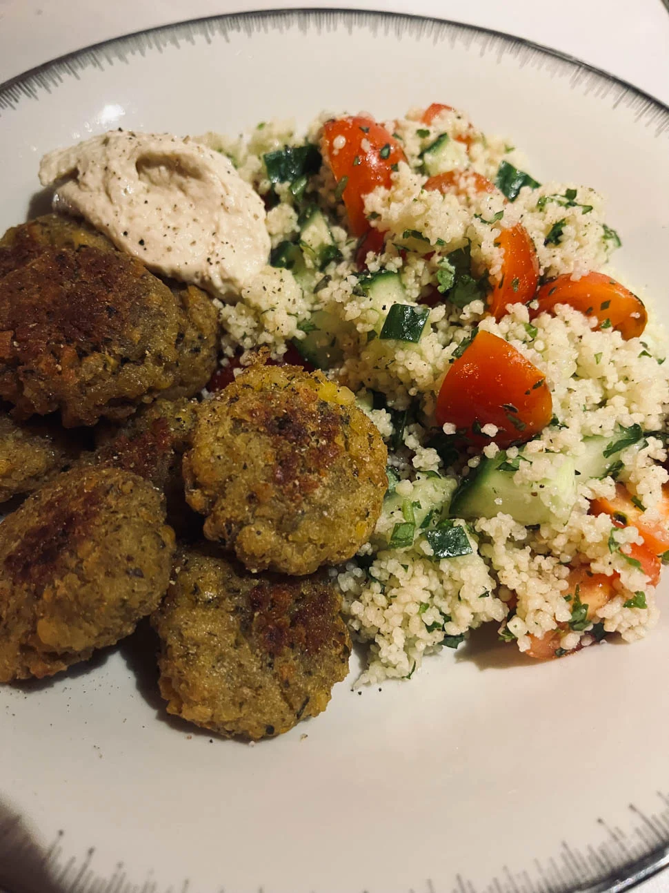 Eigenlijk is dit nog een leftover van Oud&Nieuw. We vierden dit met vrienden en een aantal van de groep zouden hapjes maken, waaronder wij. Er waren ook een paar vegetariërs dus daar wilde ik nog wat voor maken met falafel. Echter zagen we bij aankomst dat er zó veel gemaakt was, dat we besloten niet ook dit nog te bereiden. Dus uiteindelijk belandde het maandag op ons bord, met couscous met komkommer, tomaat en koriander en erbij wat hummus.
