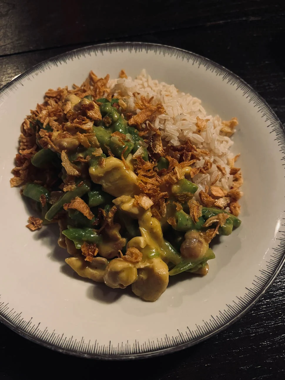 Ik maakte kip met rijst en boontjes. Er ging een kerriesausje doorheen en een lading gebakken ui overheen. Een hele makkelijke maaltijd die ik vooral maakte omdat het e.e.a. op moest. Beetje old skool dit, maar wel lekker.