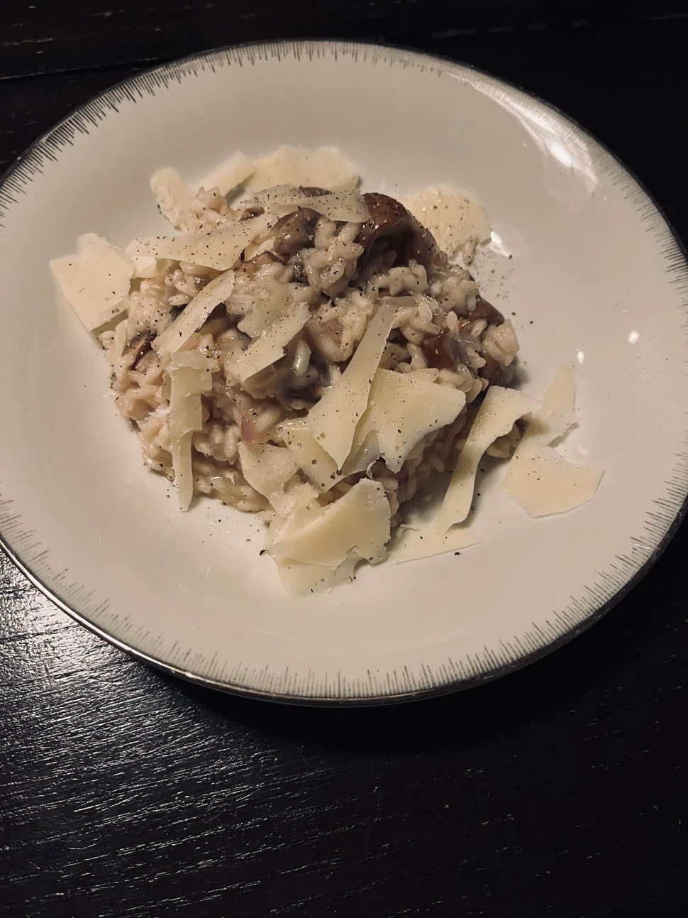 Ik heb altijd risotto in huis. Net als couscous, bulgur en rijst. Dus als ik mijn planning maak dan is 1 van deze vier soms de basis voor een gerecht. En in het weekend vinden we het heerlijk om een risotto te maken dus ik hoef dan alleen nog maar kastanjechampignons en een blok Parmezaan te halen. Want ui, knoflook en bouillonblokjes heb ik ook altijd in huis. Dus dit staat dan zo op tafel. Lekker joh, wel machtig.