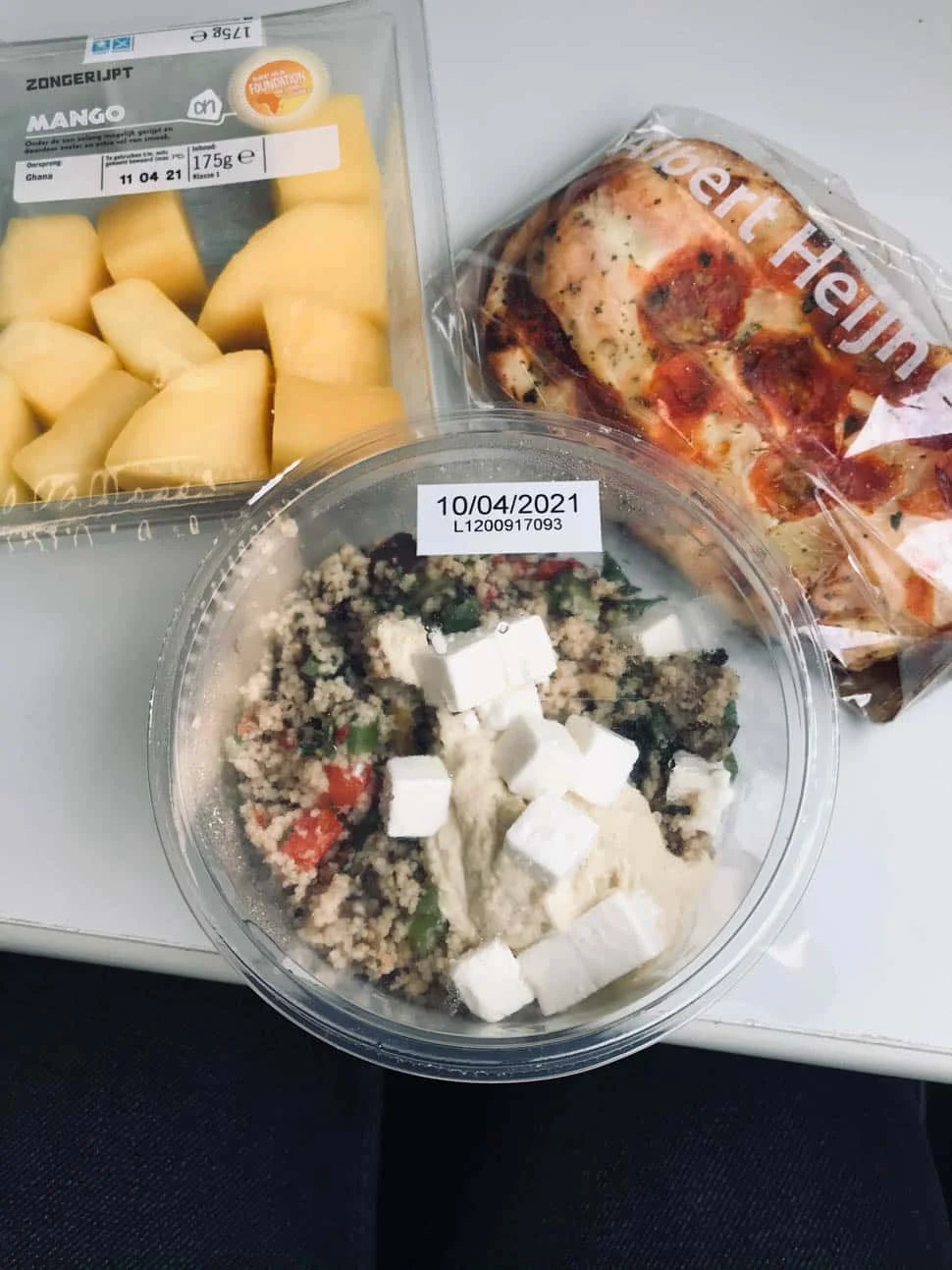 We hadden vrijdag een crematie in Brabant dus ik besloot om donderdagavond al naar mijn ouders te gaan. Dat zou wat relaxter zijn dan op de dag zelf pas afreizen dus ik stapte in de trein, Tobias volgde vrijdag met de auto omdat hij nog moest werken. En omdat ik het koken gewoon even oversloeg om niet al te laat in Brabant aan te komen –is toch een rit van 2 uur–, kocht ik een paar dingen bij de Appie op het station. Die kleine salade’s die ze tegenwoordig hebben spreken mij altijd wel aan, dus daar nam ik een bakje van mee. Met een focaccia en een bakje verse mango. Ik ben gek op mango en koop het niet vaak, want ze moeten precies goed zijn. Zo’n bakje is ook niet altijd superrijp, maar toch wel erg lekker.