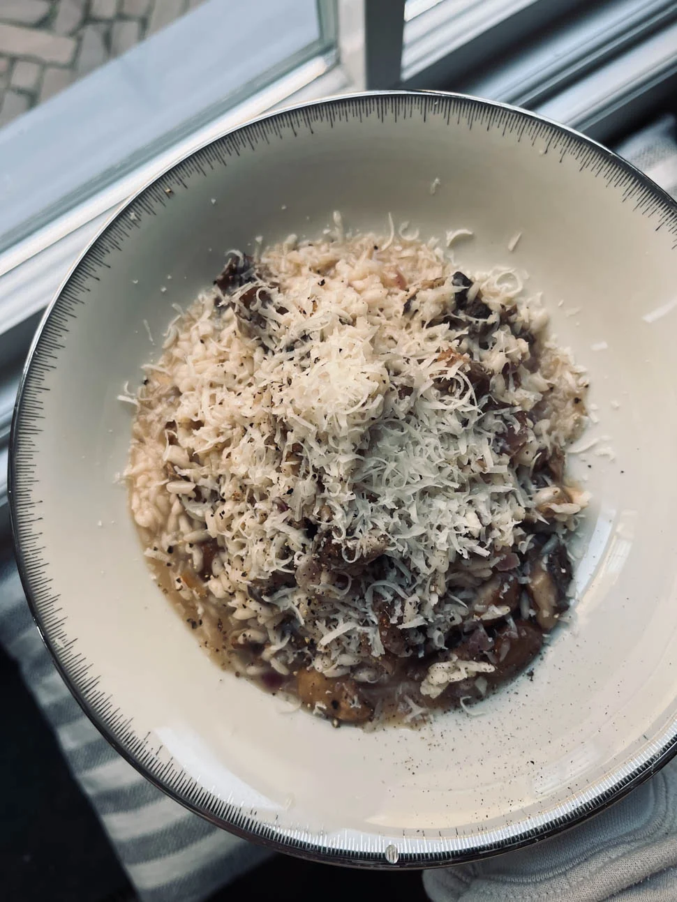 Maandag die risotto dan maar. Ik nam me voor om niet zo’n grote pan te maken omdat ik echt wel veel in huis had voor de andere dagen en we hier niet twee dagen van hoefden te eten. Maar wederom is me dat niet gelukt. Ik maakte best wat en hoewel ik dinsdag eigenlijk gewoon wat anders wilde maken, vond ik het toch zonde om dit te laten staan. Dus ik warmde het op en maakte het weer een beetje smeuïg.