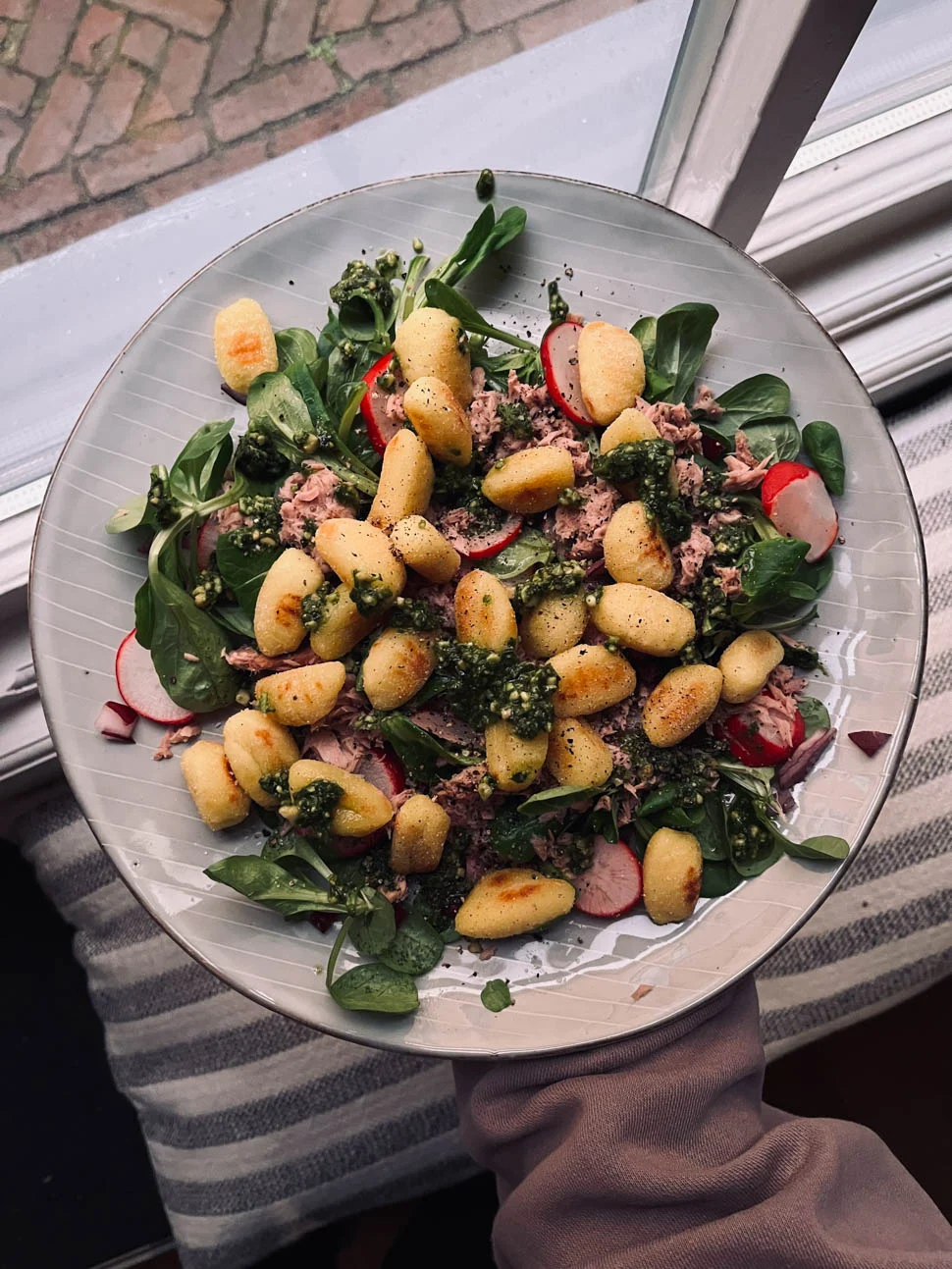 Een aardig Lente-gerecht vind ik dit. Met radijsjes, veldsla, bosui, gnocchi en pesto. De gnocchi bakten we op, en daarna husselden we alles door elkaar. Overigens een kleine variant op dit recept.