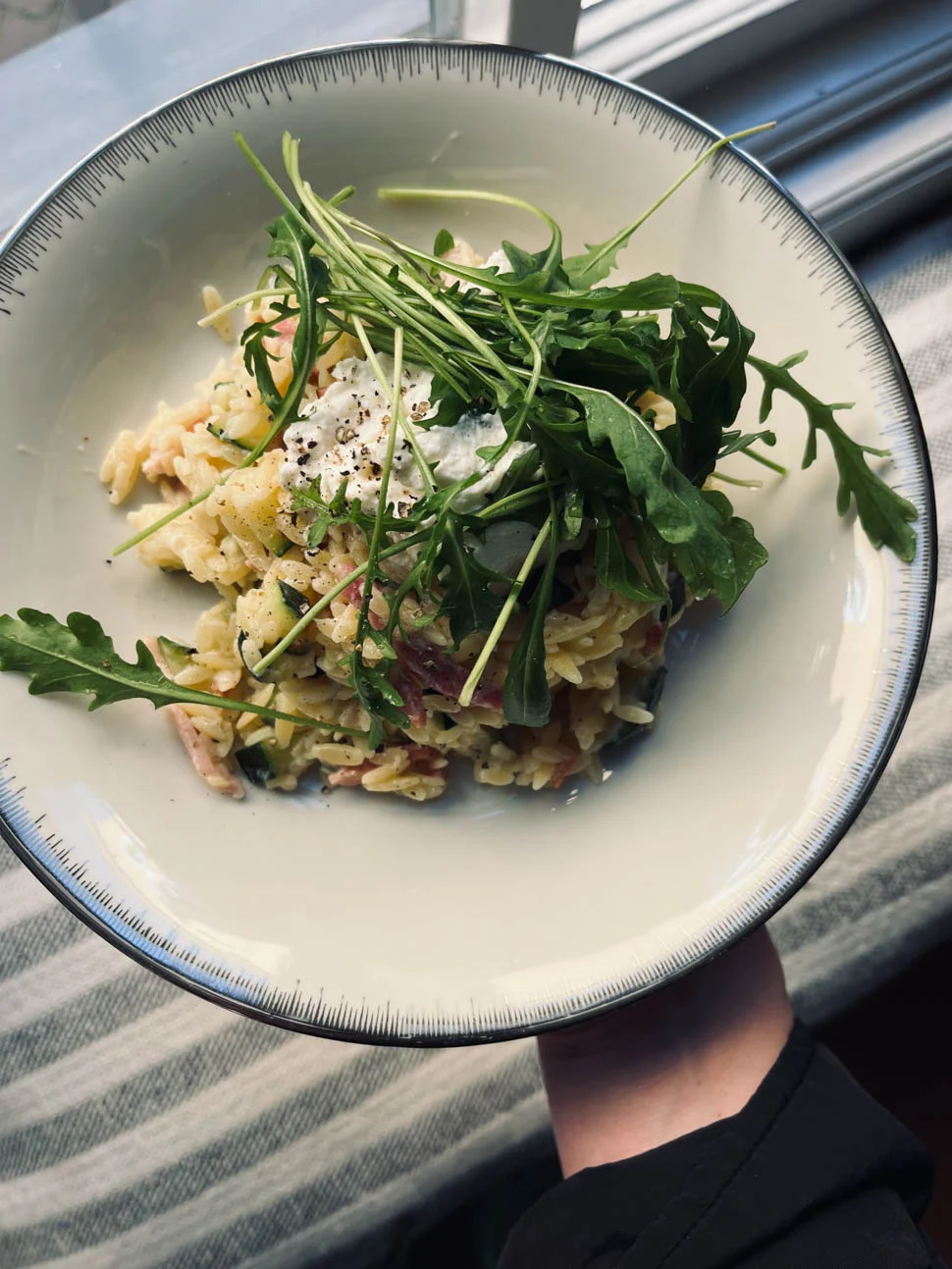 Mijn ‘één-keer-koken-twee-dagen-eten’ gerecht van deze week: een orzo salade met ricotta, citroen en spekjes. Erdoor ook nog veel courgette en erover rucola uit eigen tuin. Lekker fris, vond ‘m er echt eentje voor de lente.
