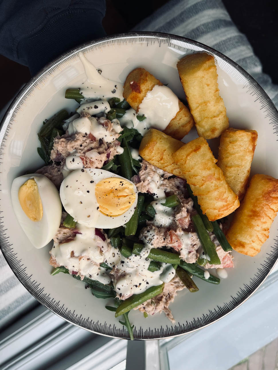 Ik maakte zondag een Salade Nicçoise, met tonijn, haricot verts, ei en een lekkere mayonaise/citroen dressing. Erbij wat aardappelkroketjes, dat maakte het compleet natuurlijk.