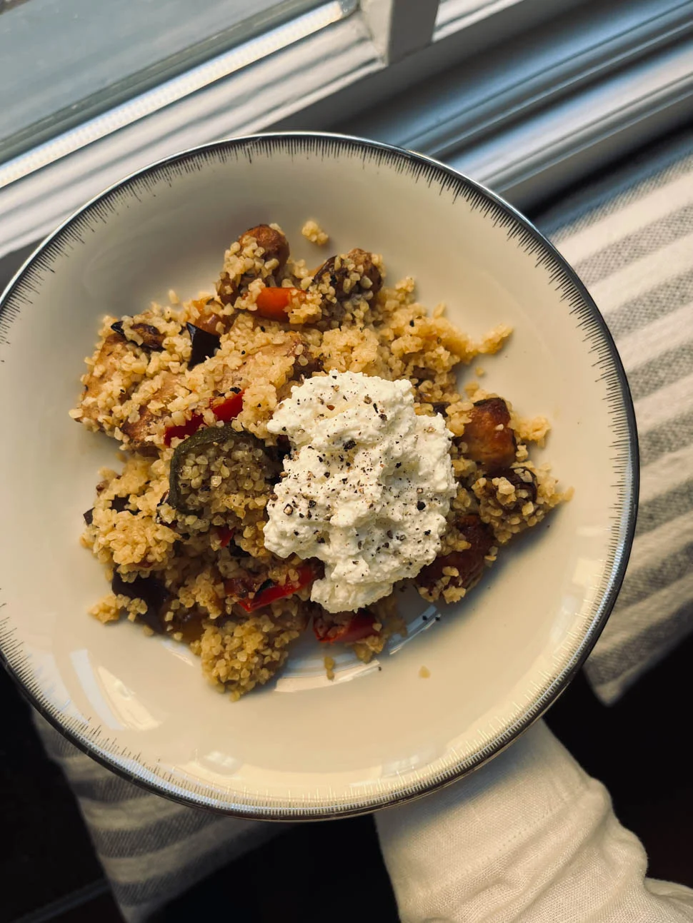 Ik maakte woensdag een bulgur salade van Ottolenghi met paddenstoelen en feta. Een flinke lading dus ik at er twee dagen van. Kwam goed uit (was stiekem wel zo gepland natuurlijk), want ik moest donderdagavond nog weg waardoor koken wat lastig zou worden.