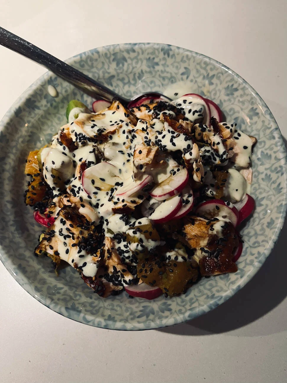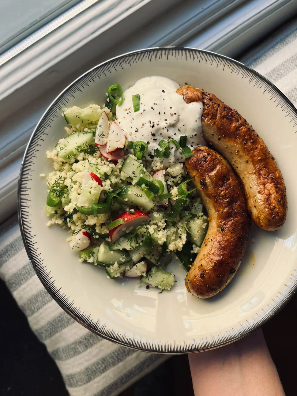 Een frisse salade dit. Wederom op basis van couscous maar nu met komkommer, radijsjes, bosui en dille. Erbij wat Griekse yoghurt met knoflook en gebakken kipworstjes. Vond dit echt een zomerse maaltijd.