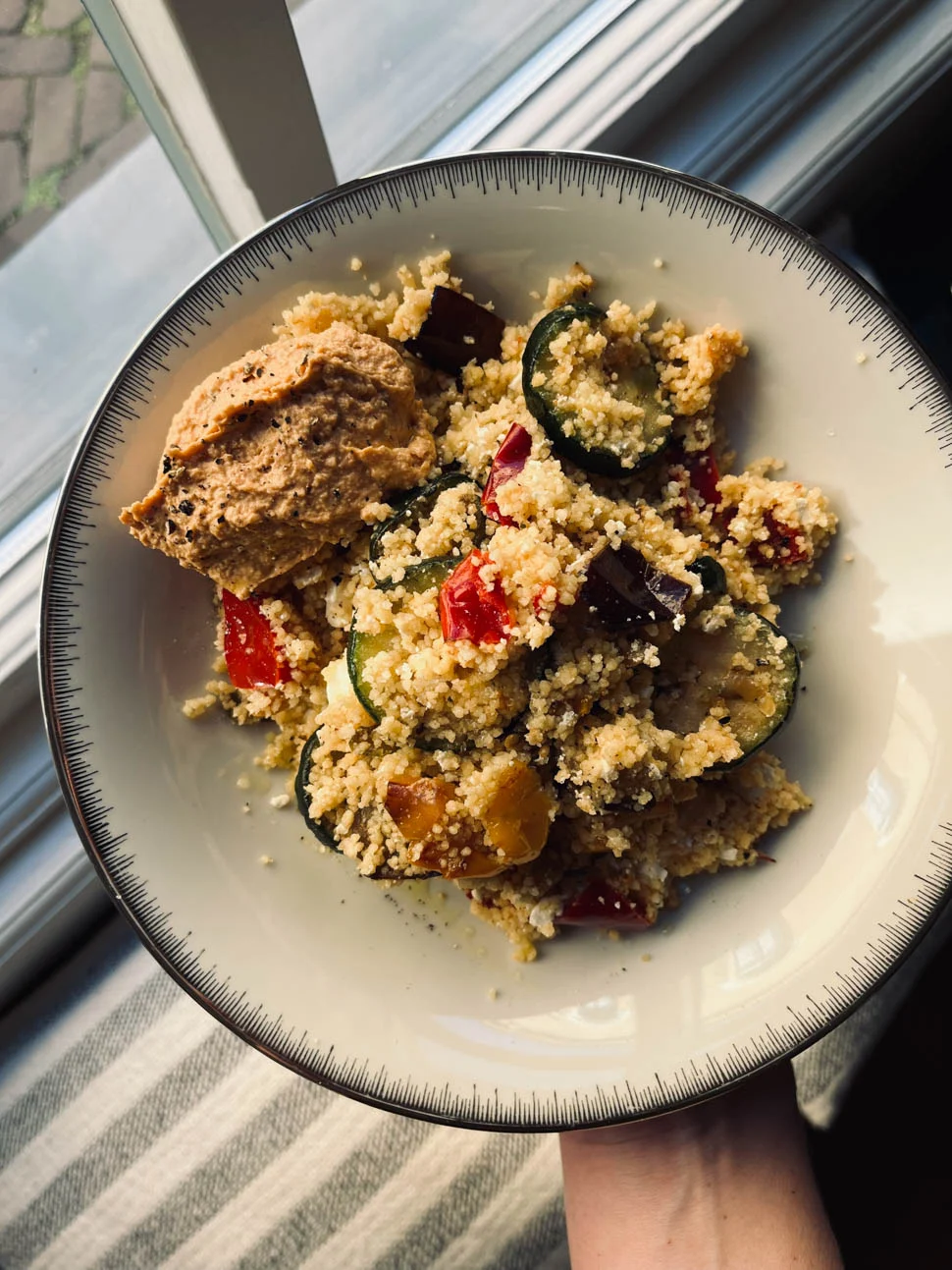 Ik maakte dinsdag een couscoussalade die ik wel vaker maak. Eentje die echt in een handomdraai op tafel staat en zo’n gerecht moet er wekelijks wel tussenzitten bij mij. Deze salade vulde ik met gegrilde groenten, witte kaas, hummus en citroen.