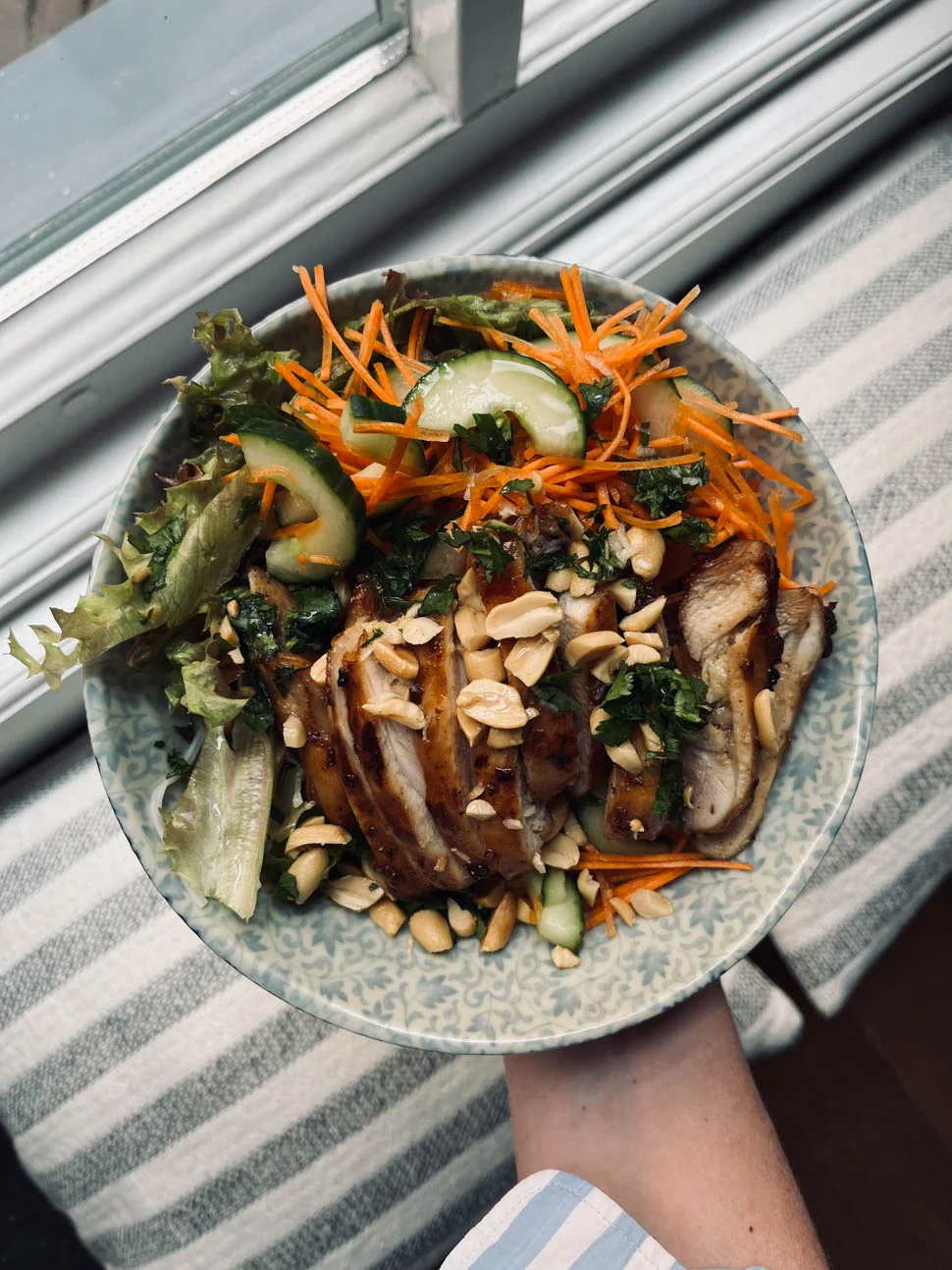Ik had vrijdag even geen zin om te koken, maar deed het toch. Ik had immers alles voor dit gerecht in huis en was er ook wel benieuwd naar. Het is een Aziatische salade met onderin de kom noodles. Daarop sla, een frisse salade van komkommer en worte en gemarineerde kipdijfilet. Er ging nog een typisch Aziatische dressing overheen en alles bij elkaar was erg lekker. Vond het wel een ingewikkeld recept voor het resultaat, dat kan makkelijker! Doen we de volgende keer.