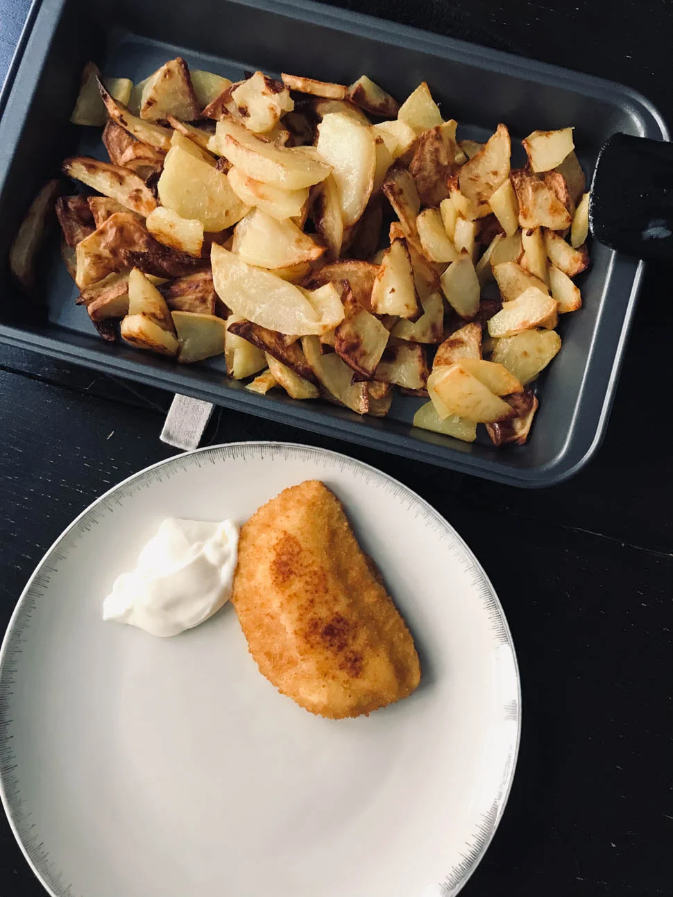 Mijn moeder kookte laatst voor ons een Hollandse pot en daar had ze boodschappen voor gedaan. Ze kocht een grote zak aardappelen en daar was nog veel van over. Wij eten dat niet standaard dus toen die zak gespot werd in onze voorraadkast, besloten we die snel maar even op te maken voordat we alles weg zouden kunnen gooien. Tobias schilde alles en sneed er frietjes/schijfjes van en bakte dit lekker in de oven. Erbij aten we deze vegetarische kaasschnitzel, die kocht ik laatst in een aanbieding om eens uit te proberen.
