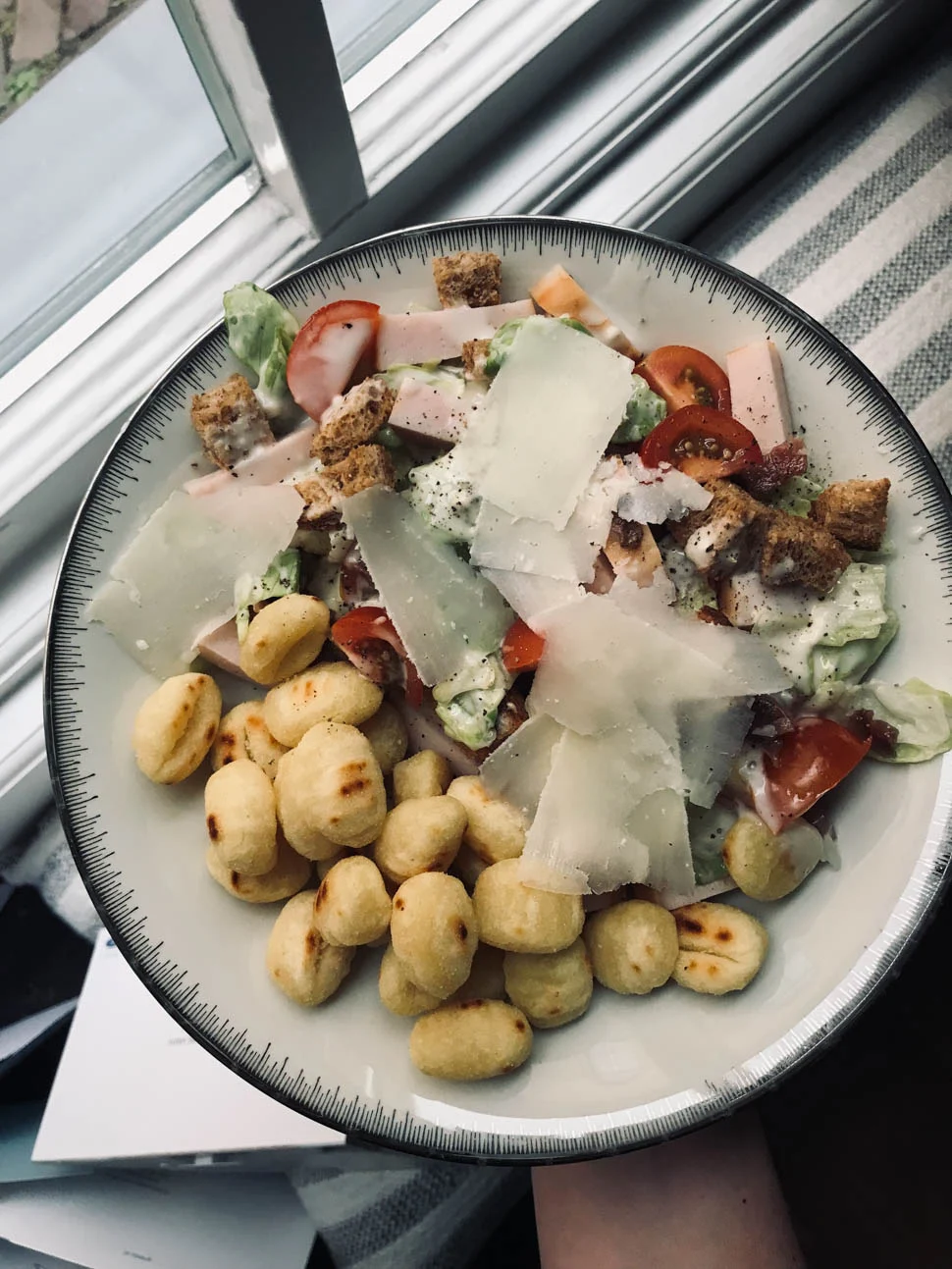 En omdat er meer ingrediënten zijn die ik nu dus weer mag eten, besloot ik ook weer een Ceasar Salad op het menu te zetten. Dit at ik nog steeds wel de laatste tijd, maar aangepaste versies. Nu dus even lekker old skool, met ansjovis en pecorino (vind ik nog lekkerder dan parmezaan). Erbij bakte ik gnocchi op, iets vullender dan alleen een salade. En ik hou ook van gebakken gnocchi. Heerlijk.