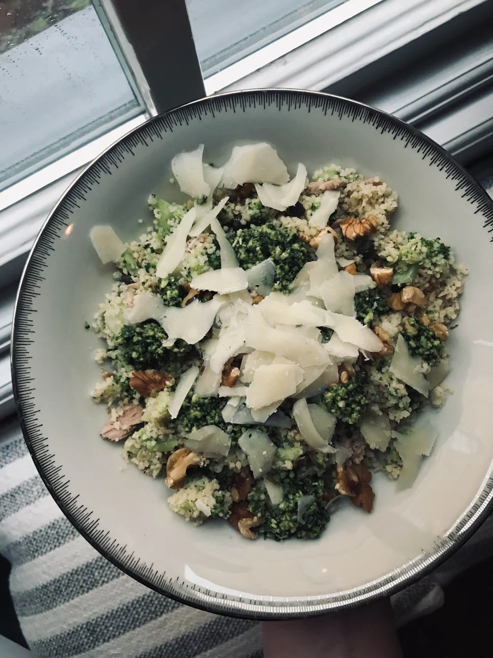 Dit is een recept dat ik waarschijnlijk vaker ga maken. Vond het erg lekker. Ik spotte dit op de site van de Appie en gaf er mijn eigen draai aan. Het is couscous met tonijn uit blik, kappertjes, walnoten, pecorino, pesto, en broccoli. Gezonde ingrediënten aangevuld met flinke en hele lekkere smaakmakers. Favorietje, nu al.
