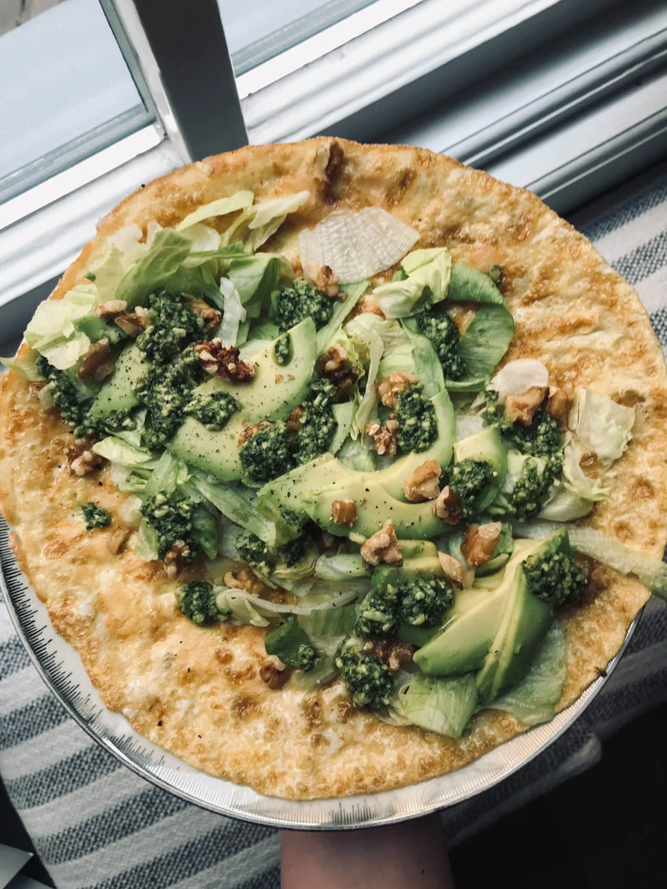 Tobias at restjes, want we hadden nog van alles in de koelkast staan. Ik maakte deze omelet met ijsbergsla, avocado, pesto en walnoten. Zo gemaakt, en lekker licht. Veel honger? Eet je er twee.