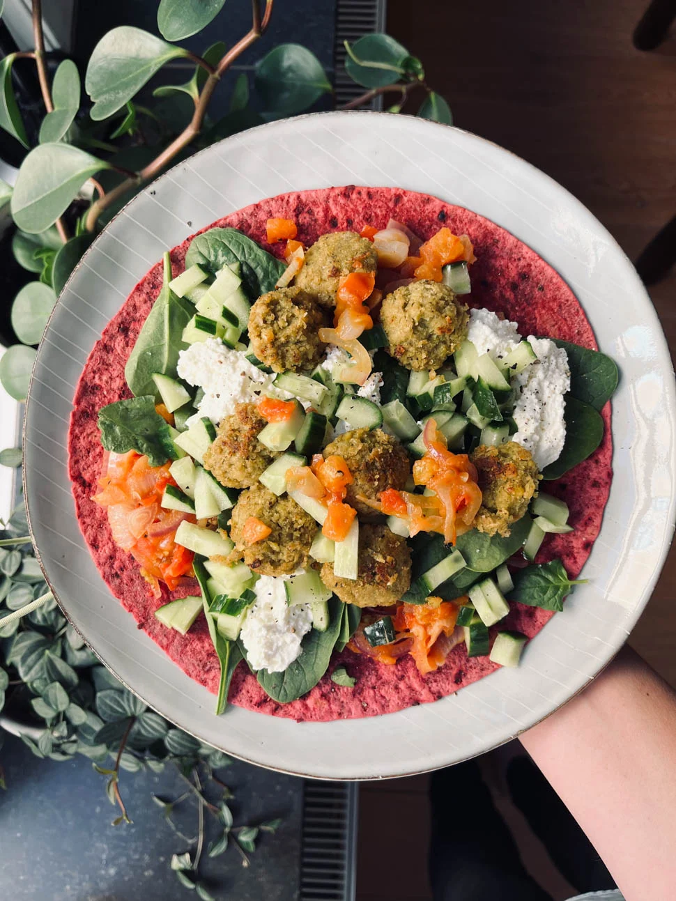 Deze heb je laatst ook voorbij zien komen en die beviel bijzonder goed. Zo goed dat ik het recept weer inplande voor de afgelopen week. Het is een wrap met gebakken ui en tomaat, met cottage cheese, spinazie, komkommer en falafel. Nu zijn we hier in huis sowieso wel gek op falafel dus vaak als dit in een gerecht zit, dan is het wel wat voor ons. Lekkere lichte hap dit.