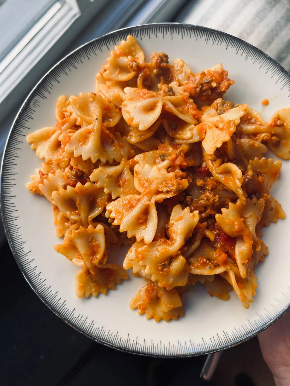 De vriezer leegtrekken betekent bij ons zelfgemaakte hapjes voor Louie opmaken, diepvriesgroenten verwerken in gerechten maar óók een zak zelfgemaakte bolognesesaus tegenkomen. Die planden we dus in voor de woensdag, een pasta bolognese. We kookten er alleen deze vlinderpasta bij.