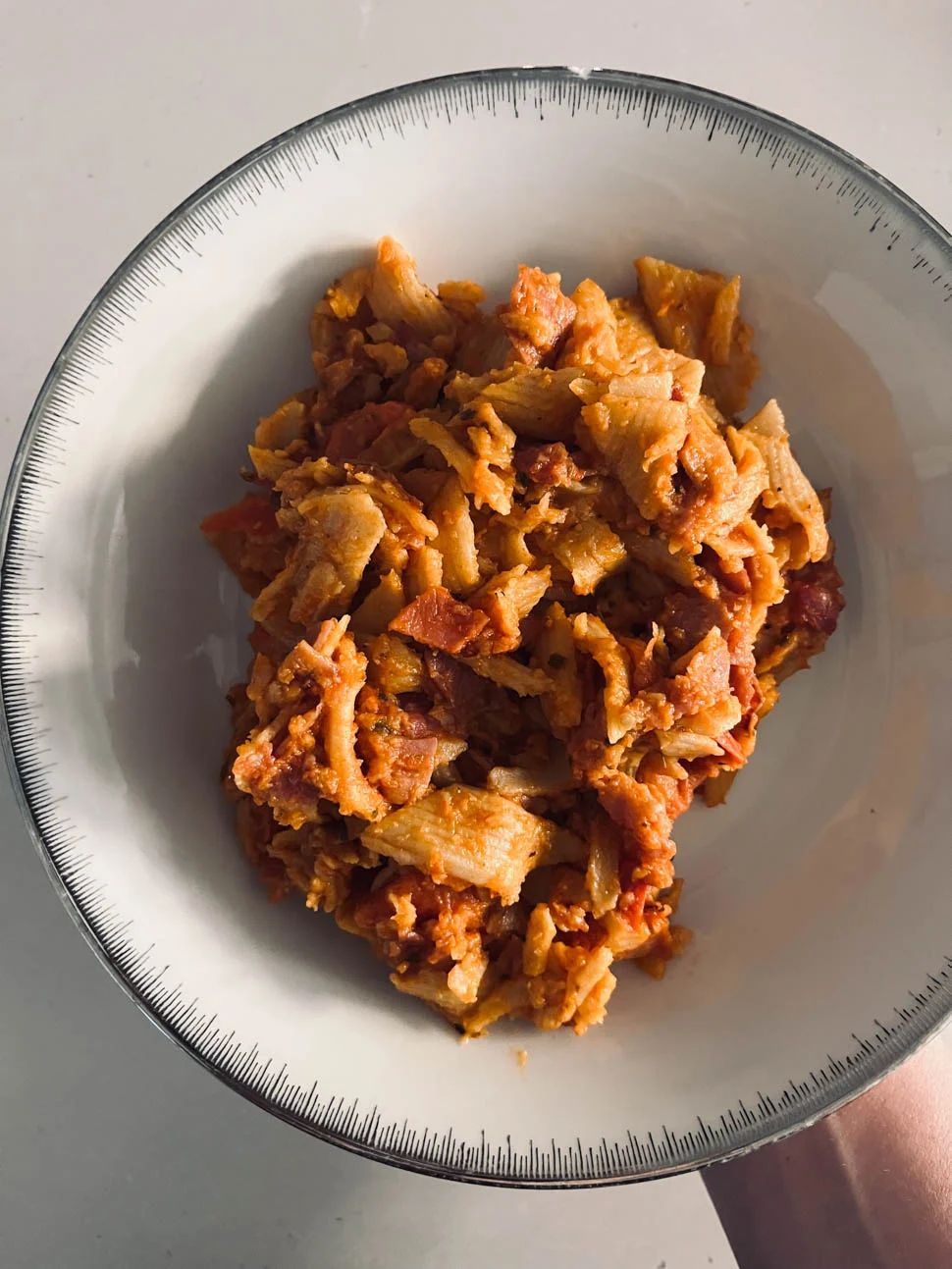 Ik vond dus ook nog een grote zak met onze simpele pasta. Met gebakken ham en cherrytomaatjes. Eeuwig zonde om die weg te doen natuurlijk en dat hoefde ook helemaal niet dus die planden we in voor de vrijdag. Zo, ook weer geregeld! Ziet er alleen niet heel fraai uit, op dit bordje. Lekker was het wel gelukkig :-)