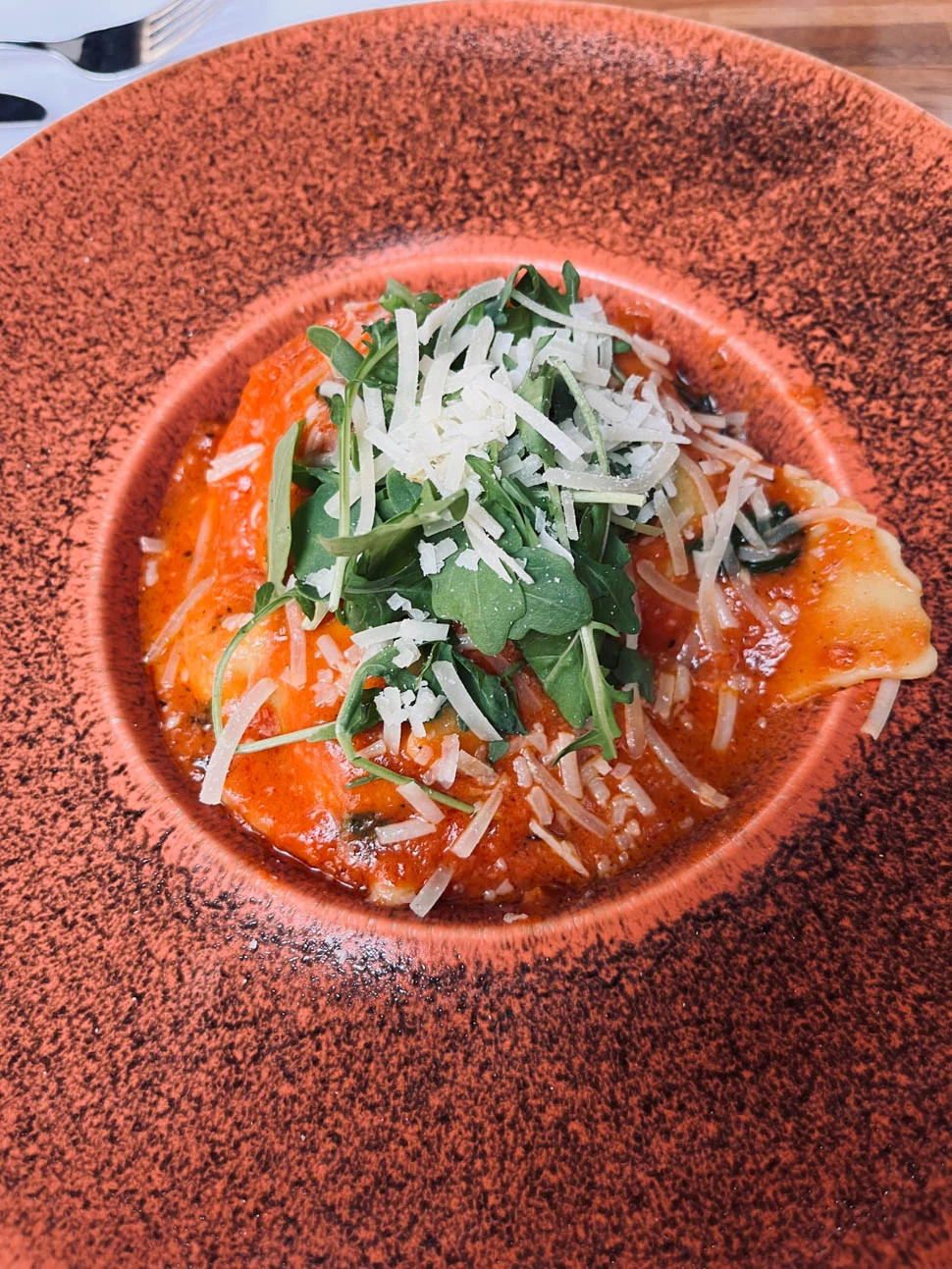 Wij besloten er met z’n drieën even lekker op uit te gaan met dit mooie zomerweer. Aan het einde van de middag zaten we bij een pizzaria hier in Deventer en ik bestelde daar eens geen pizza, maar deze lekkere ravioli met ricotta en spinazie in tomatensaus.