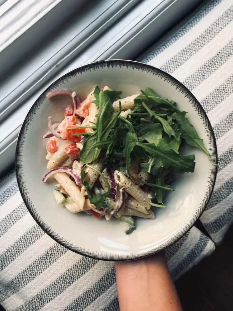 Kijk, het voordeel van geen eetplanning maken is dat je eerst opmaakt wat je nog hebt. Een flinke bak tzatziki bijvoorbeeld. Deze had ik bij mijn pita gyros besteld de vorige avond, maar het was veel meer dan ik had verwacht. Zonde om weg te doen natuurlijk dus ik had al bedacht dat ik het door een pastasalade heen zou kunnen roeren. Samen met tomaat, komkommer, rucola en rode ui.