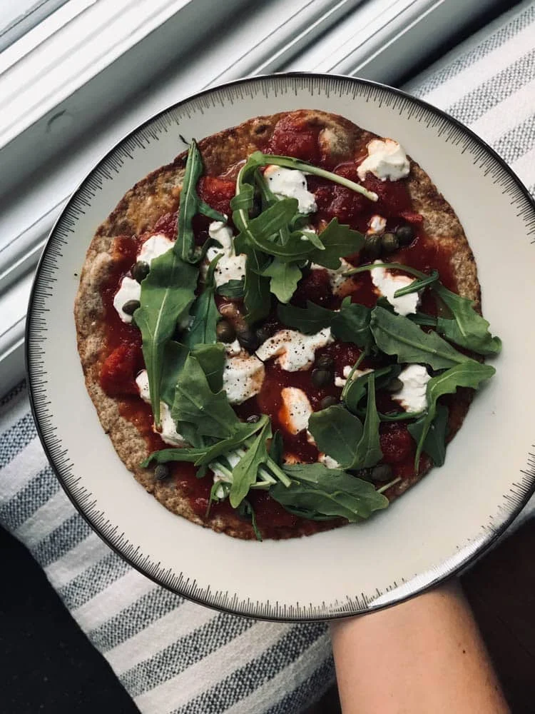 Ik maak wel eens vaker pizza’s uit de pan maar er is er eentje die er qua beleg voor mij uitspringt. Namelijk omdat deze zo lekker is, en maar weinig ingrediënten bevat. Namelijk; tomatenblokjes, geitenkaas, kappertjes en rucola.