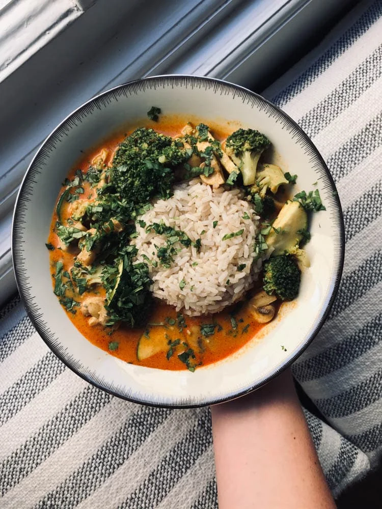Eigenlijk het moment dat ik écht boodschappen moest gaan doen, maar een curry in onze voorraadkast spotte. Kokosmelk heb ik altijd staan, net als zilvervliesrijst. Dus Tobias haalde alleen nog wat verse groenten zodat ik die curry in elkaar kon draaien. Was wel een Thaise herbeleving hoor. Niet persé qua smaak, maar voornamelijk de combi van een curry en bloedhitte.
