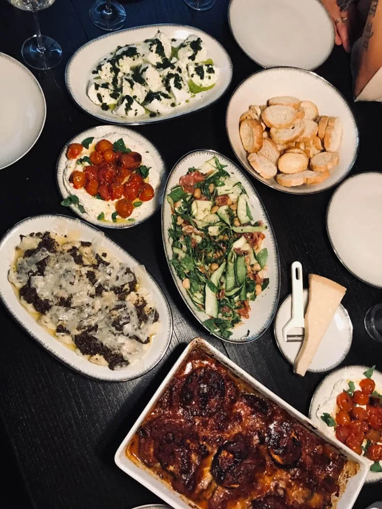 Als ‘hoofdgerecht’ zette ik verschillende dingen op tafel. Een melanzane, ricottaspread met geroosterde tomaatjes, een frisse salade, buffelmozzarella met pistou en dus de gnocchi. En die gnocchi ga ik de volgende keer gewoon niet meer zelf maken. Leuke klus, mooi deeg, lekker saus erover. Maar die gnocchi was gewoon niet goed gelukt.