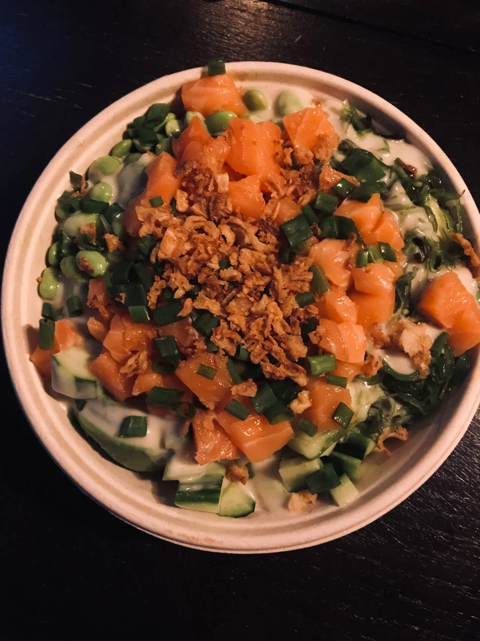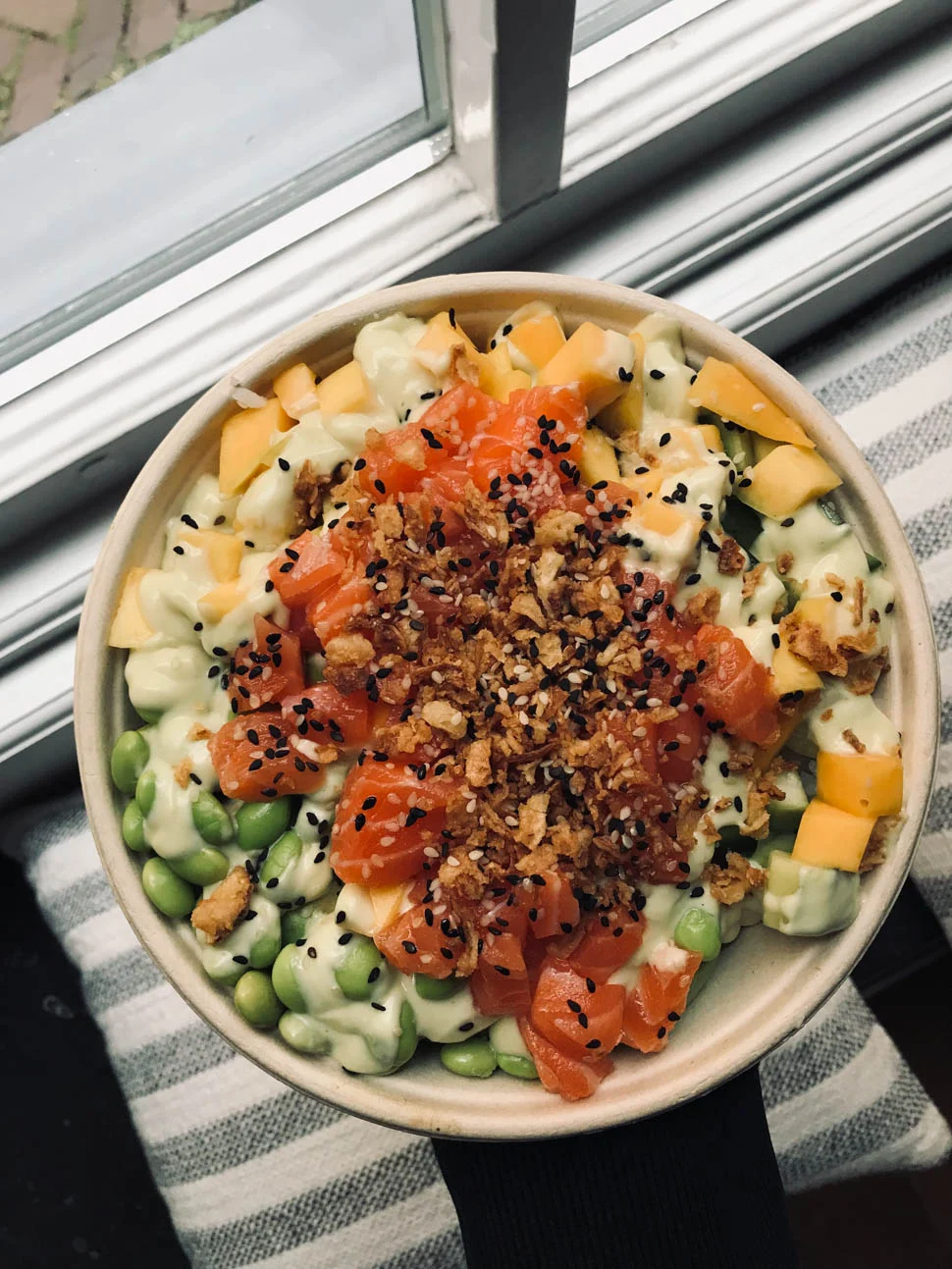Ik at alleen en de dag vloog voorbij. Ineens was het al 19u en ik had eigenlijk al een beetje bedacht om gewoon even makkelijk te doen. Ik bestelde nog een keer een poké bowl, heerlijk vind ik ze. Maar deze keer stelde ik hem zelf samen want in de standaard variant die ik zondag at, vond ik teveel zeewier zitten. Een beetje vind ik wel lekker hoor, maar het was een beetje teveel van het goede.