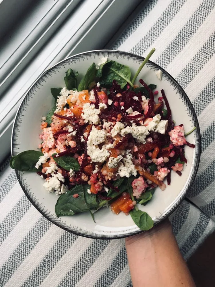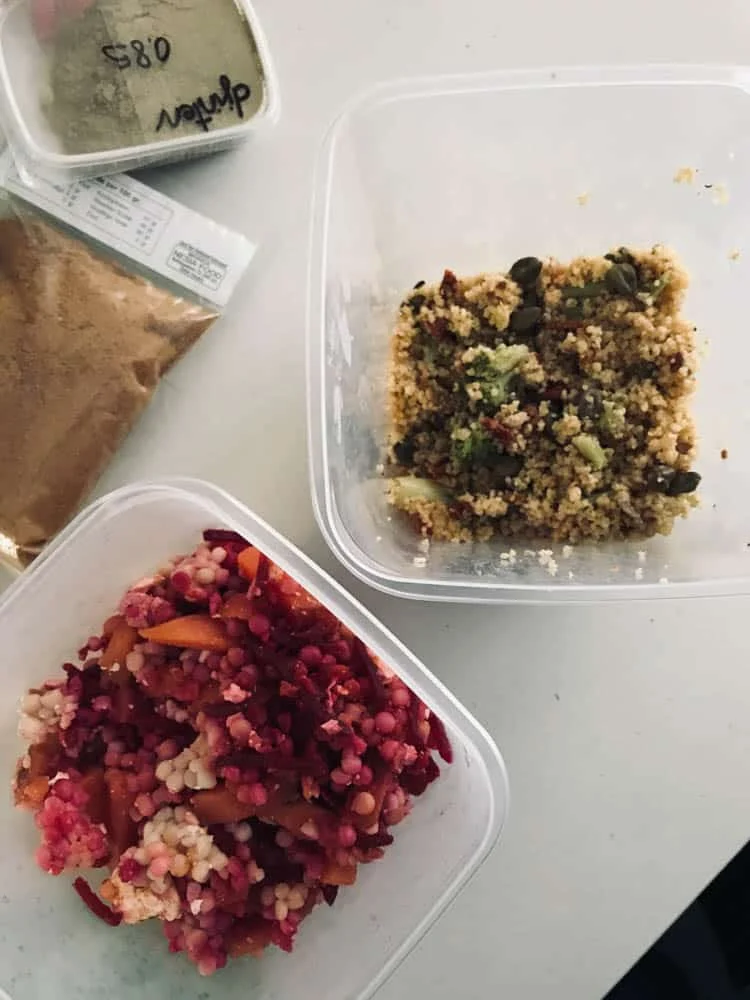 Ik maakte wederom couscous, maar nu parelcouscous. Met spinazie, zoete aardappel, rode biet, feta en wat kruiden.