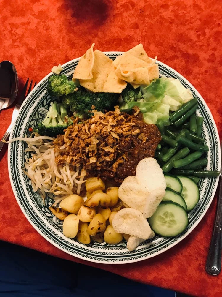 Gado Gado op het menu! Ideaal voor een grote groep want je maakt verschillende groenten klaar die je lekker vindt (kort koken, voor een bite. En de aardappeltjes horen er niet bij, maar er is ook een kindje aanwezig dus dat leek ons een goed idee). En omdat dat vrij simpel is, legde ik de focus op de pindasaus. Daar dus uitgebreid te tijd voor genomen en het resultaat mocht er dus zijn. Er zat veel in, denk aan trassi, rode pepers, sereh, palmsuiker, ketjap, sambal, limoensap en nog meer. Ga ik zeker nog eens maken. Erbij verder nog een flinke lading kroepoek, cassave, komkommer en gebakken ui. O, en het eitje zijn we vergeten!