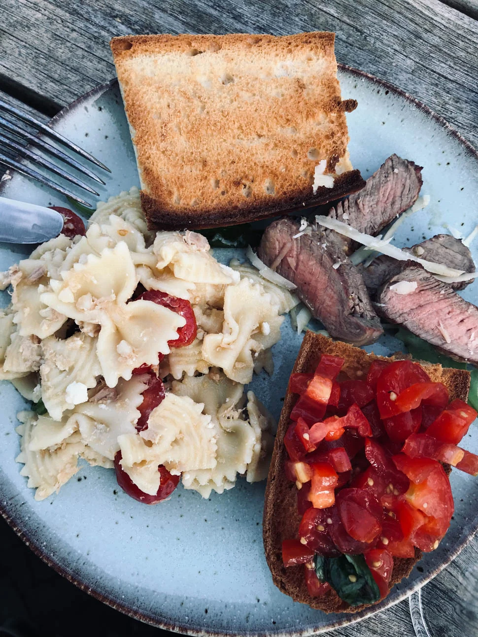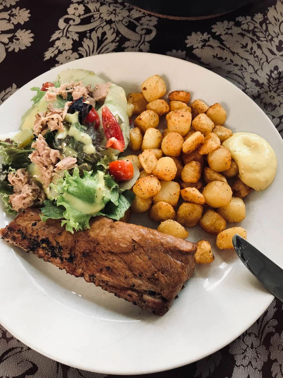 Ja! Goed gezien, ik at bij mijn ouders maandag. Ik was een dagje in Breda met een vriendin en mijn moeder paste op. Ik bleef er een nachtje slapen in verband met een begrafenis de volgende dag dus deze lekkere hap zette m’n moeder voor ons op tafel. Een salade met tonijn, gebakken aardappeltjes en een stukkie varkenshaas.
