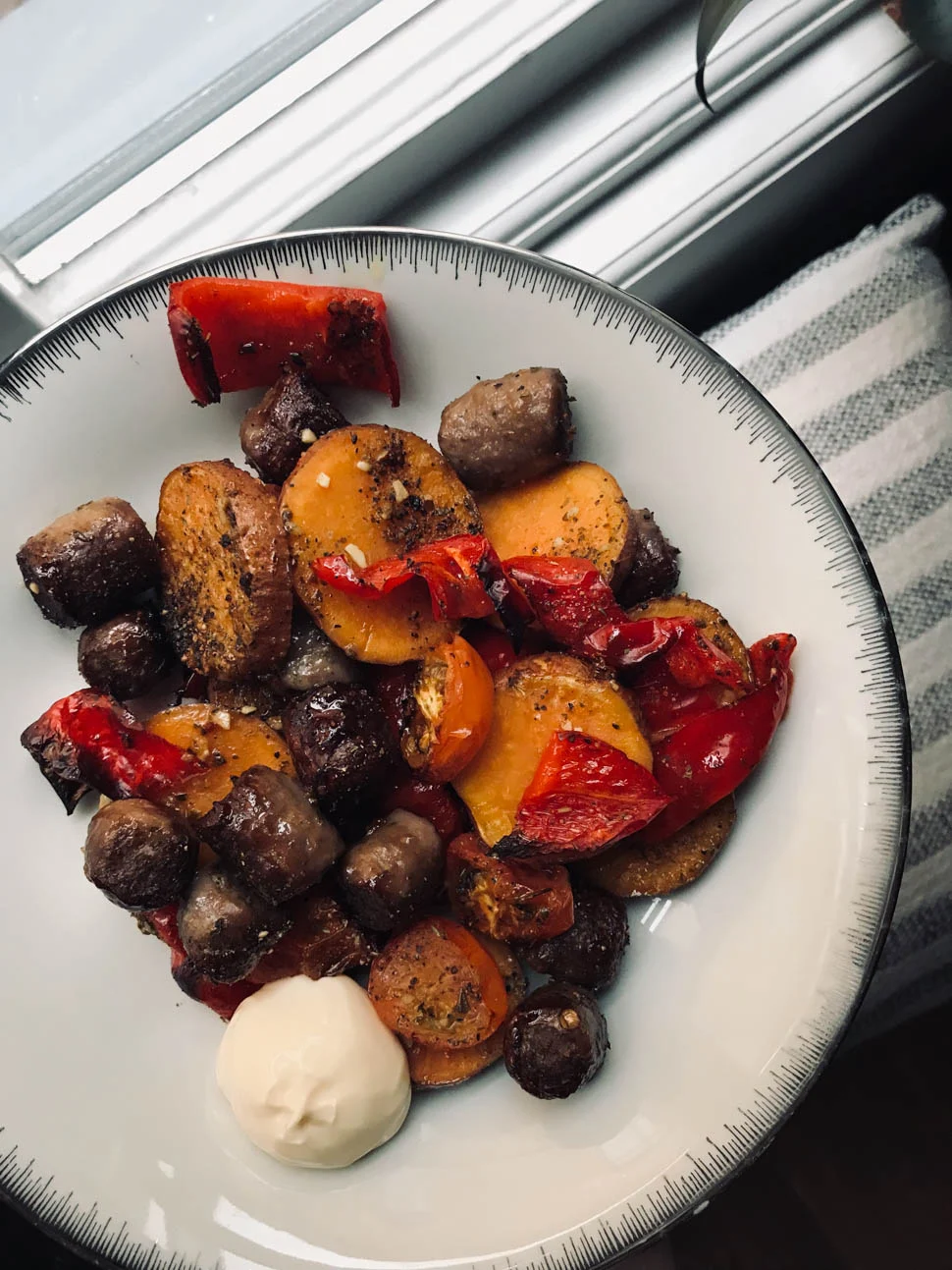 Zoals je ziet; ik sneed wat groenten en chipolataworstjes in stukken en stopte dat in de oven. Gewoon op de bakplaat, met wat olijfolie, peper en zout en lekkere kruiden. Dotje mayo erbij en klaar.